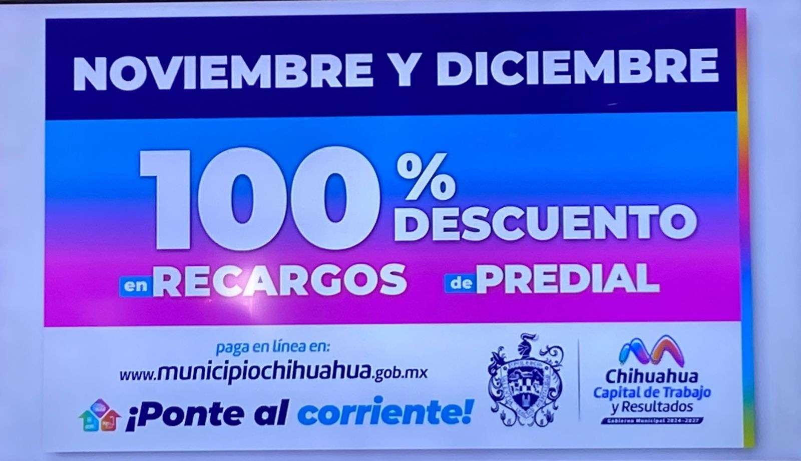 Este descuento, que se presenta por primera vez en el municipio, se ofrece en solidaridad con los chihuahuenses que no han podido realizar su pago por diversos motivos, por lo que invitaron a los ciudadanos a aprovechar esta oportunidad y ponerse al corriente.