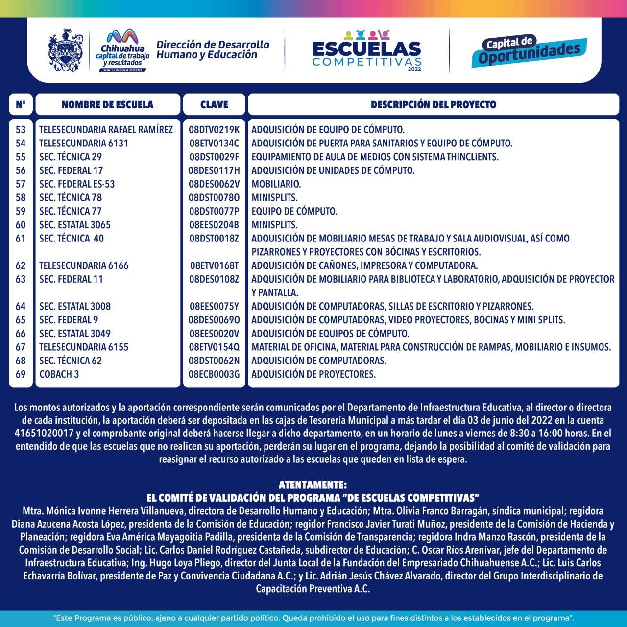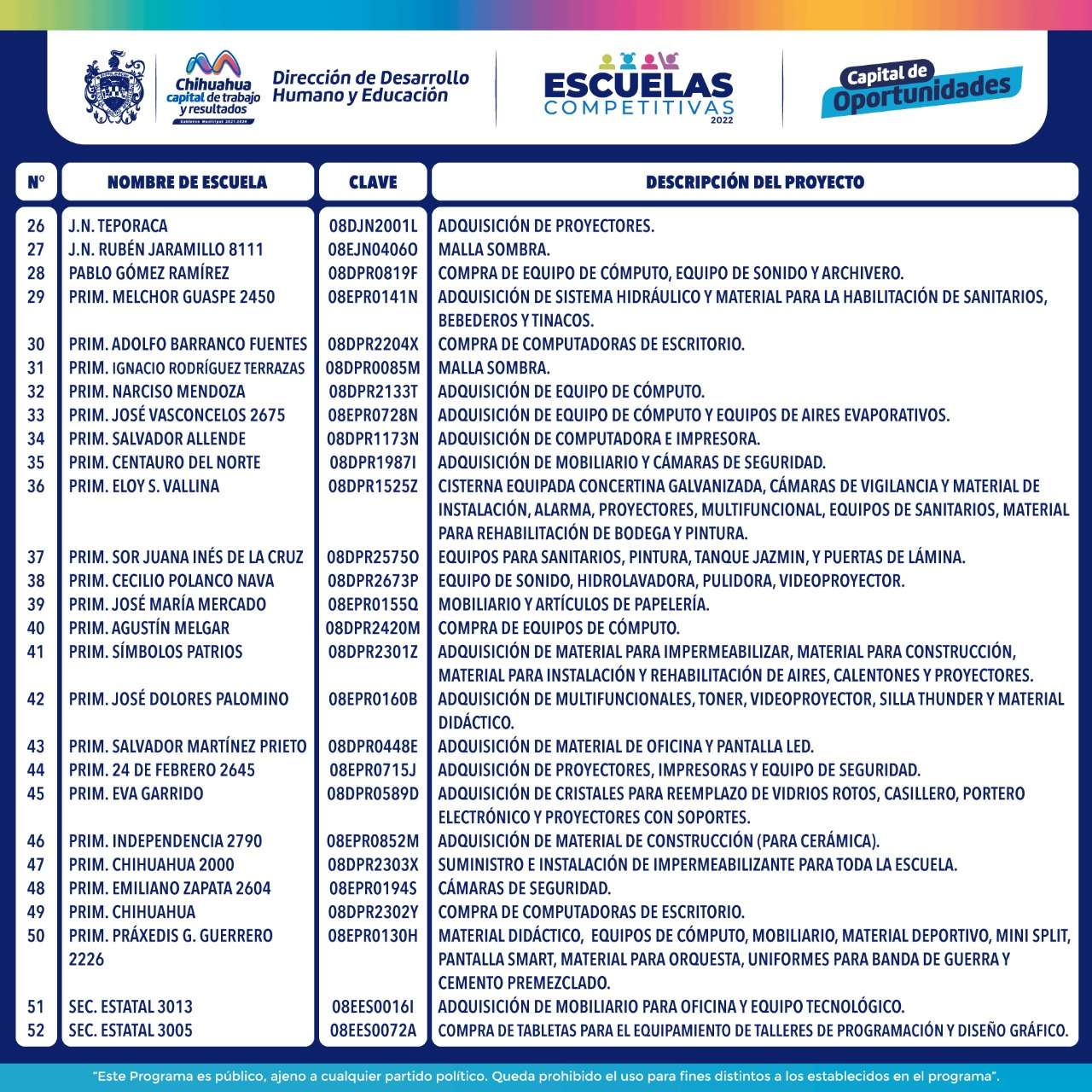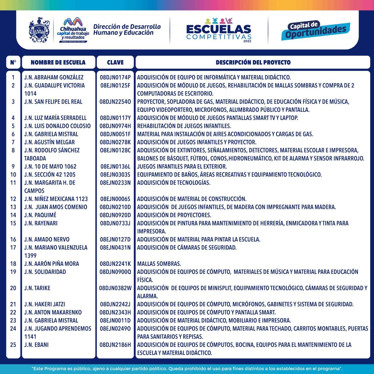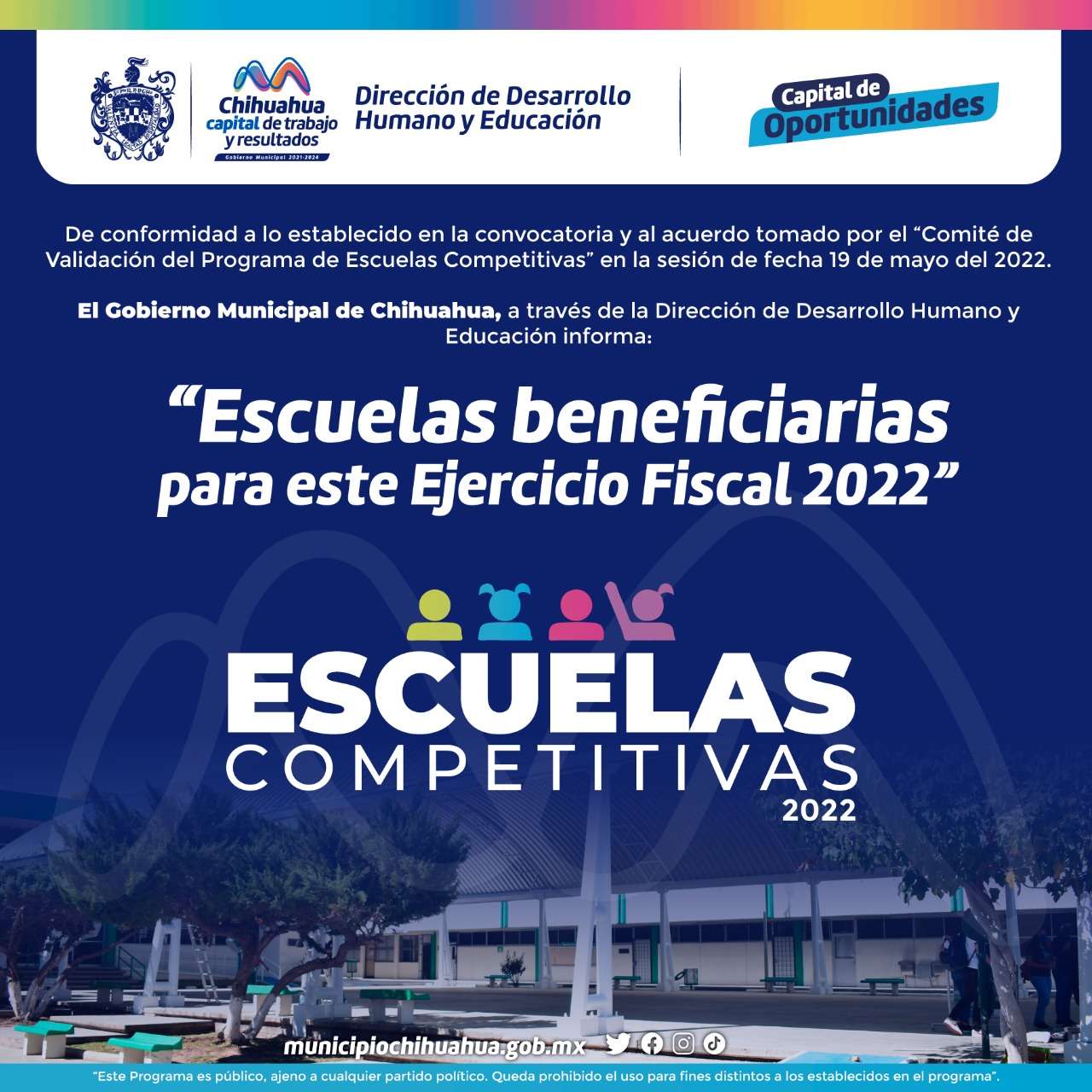 Chihuahua.- El Gobierno municipal, a través de la Dirección de Desarrollo Humano y Educación, da a conocer la lista de las 69 escuelas que serán beneficiadas con el programa “Escuelas Competitivas 2022”, dirigido a los planteles educativos de la ciudad que buscan mejorar su equipamiento o instalaciones.