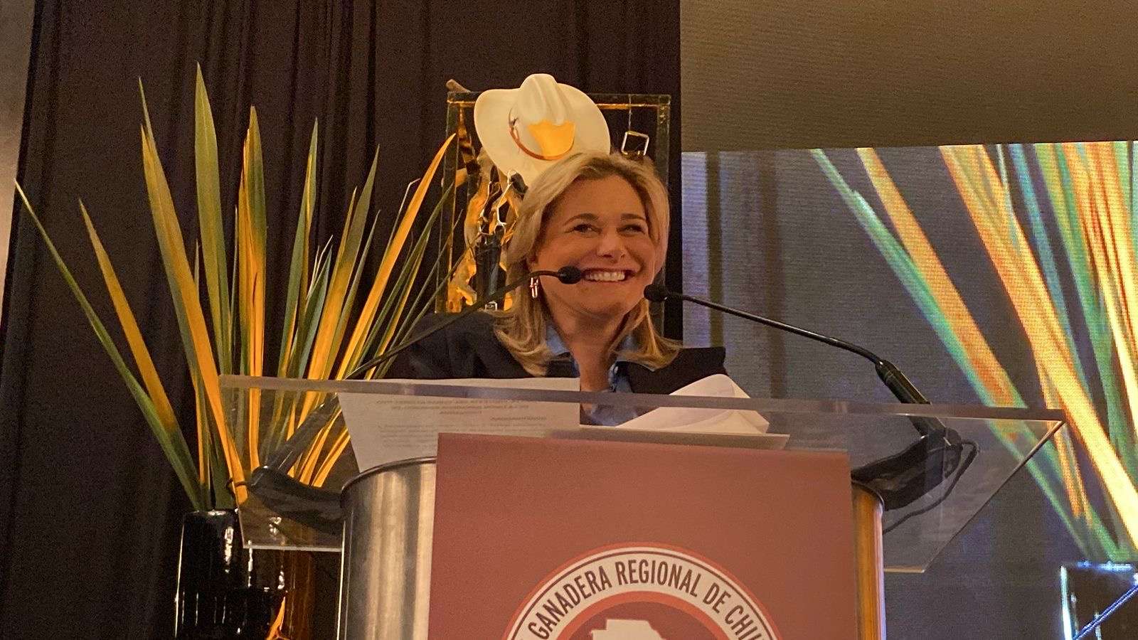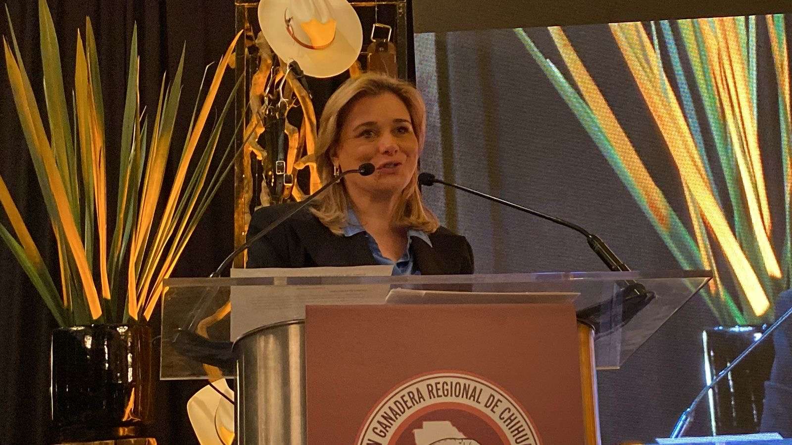 Chihuahua.- La Gobernadora del Estado Maria Eugenia Campos Galván en su discurso a los ganaderos, señaló que su misión es dentro de su ámbito de competencia buscar la oportunidad para abrir caminos de diálogo con los Estados Unidos y asi explorar todas las alternativas a su alcance para poder recuperar el ritmo de exportación óptimo que necesitan todos los productores.