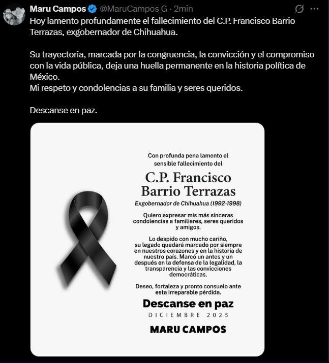 En su publicación, la mandataria estatal destacó la trayectoria política de Barrio Terrazas, subrayando que estuvo marcada por la congruencia, la convicción y el compromiso con la vida pública, cualidades que señaló dejaron una huella permanente en la historia política de México.