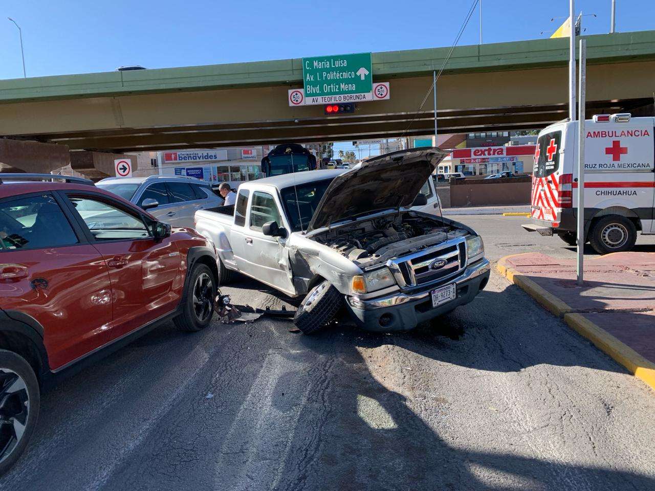 Chihuahua.- Al menos dos personas resultaron heridas luego de un accidente que involucró a tres vehículos.