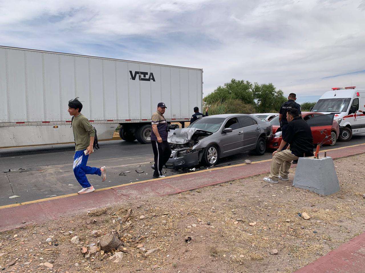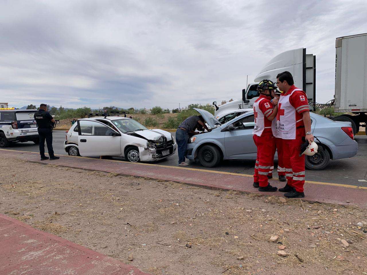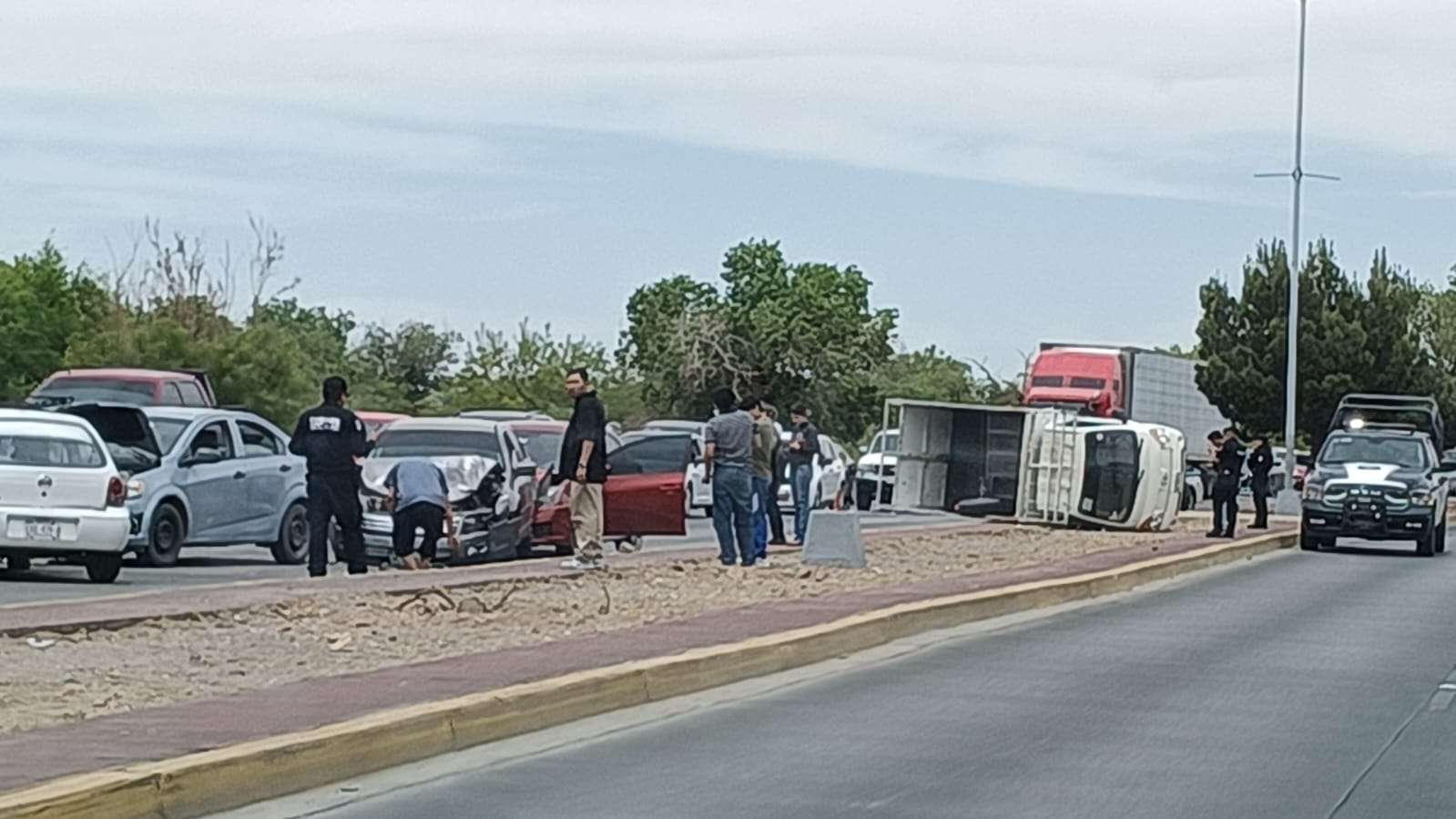 Chihuahua.- Un choque múltiple entre cuatro vehículos y una posterior volcadura dejó como saldo dos personas con lesiones leves en la vialidad Sacramento en sentido norte a sur, antes del puente de Cementos.