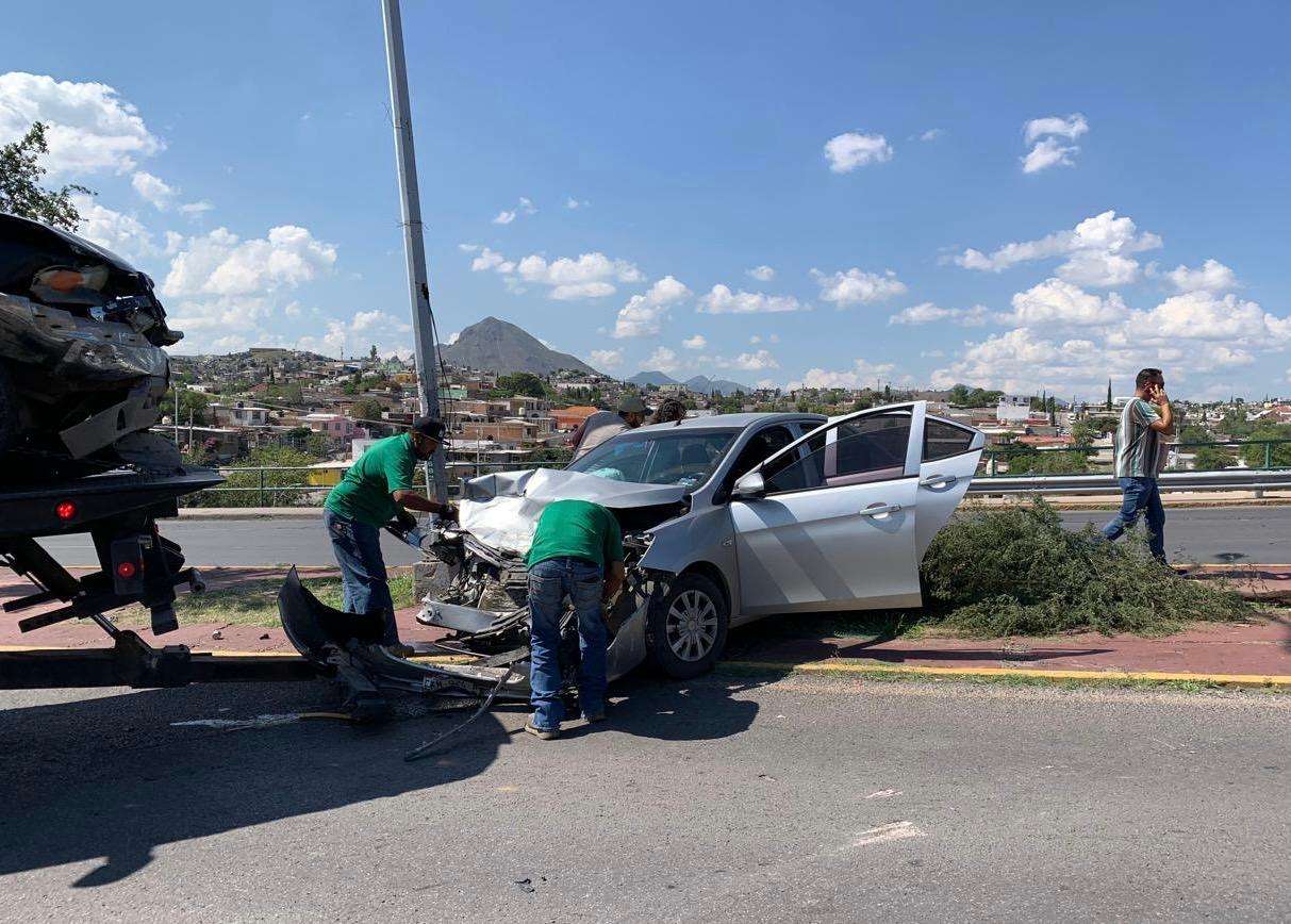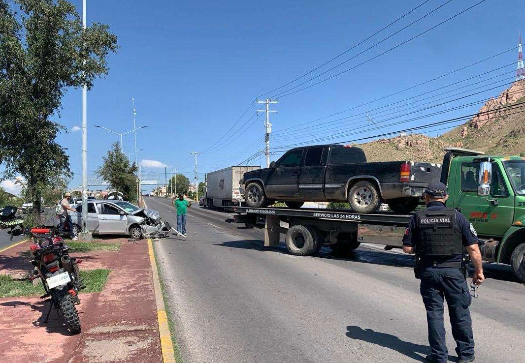 Chihuahua.- Un aparatoso accidente vial dejó como saldo al menos dos personas heridas y cuantiosos daños materiales.