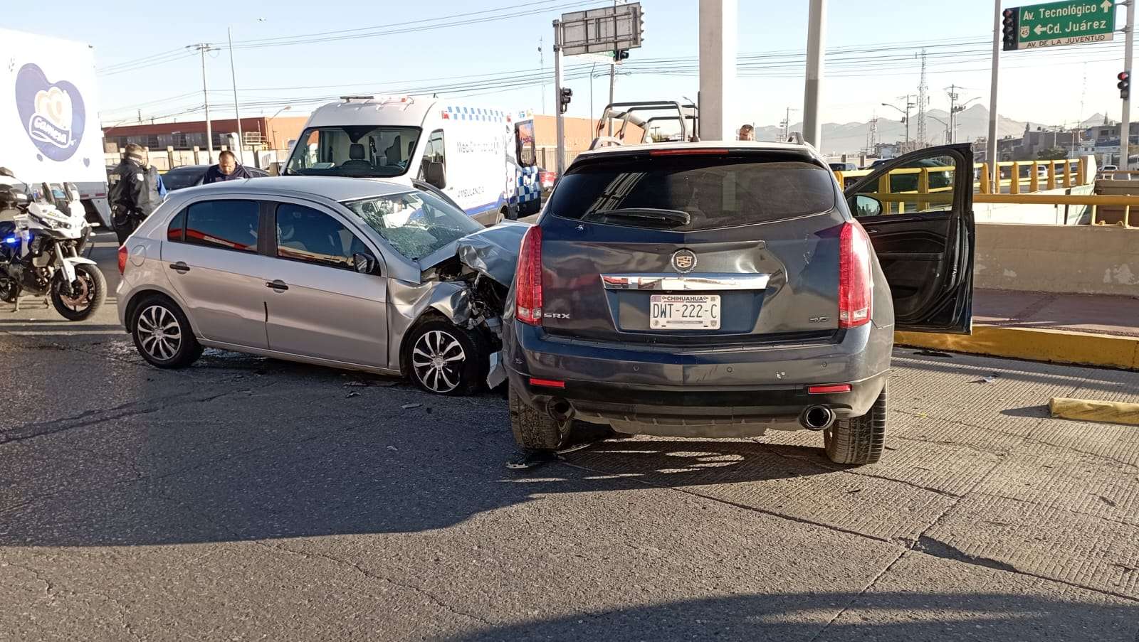 Chihuahua.- Un aparatoso choque se registró la mañana de este sábado en el cruce de la lateral del Periférico de la Juventud y la avenida Juan Escutia, luego de que el conductor de una camioneta Cadillac SRX intentara incorporarse sin la debida precaución.