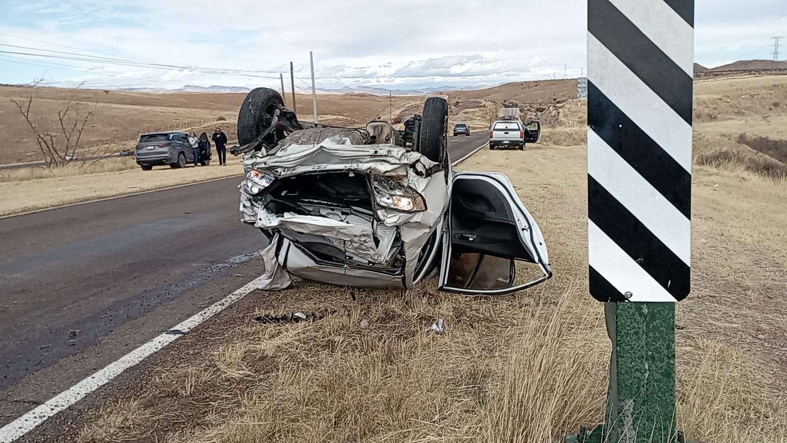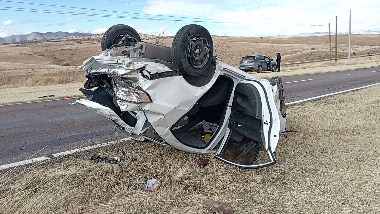 Chihuahua. - Una aparatosa volcadura se registró a la altura del kilómetro 25 de la carretera que conduce de Chihuahua a Cuauhtémoc, luego de que el conductor de un automóvil Chevrolet Aveo, color blanco, perdiera el control del volante.
