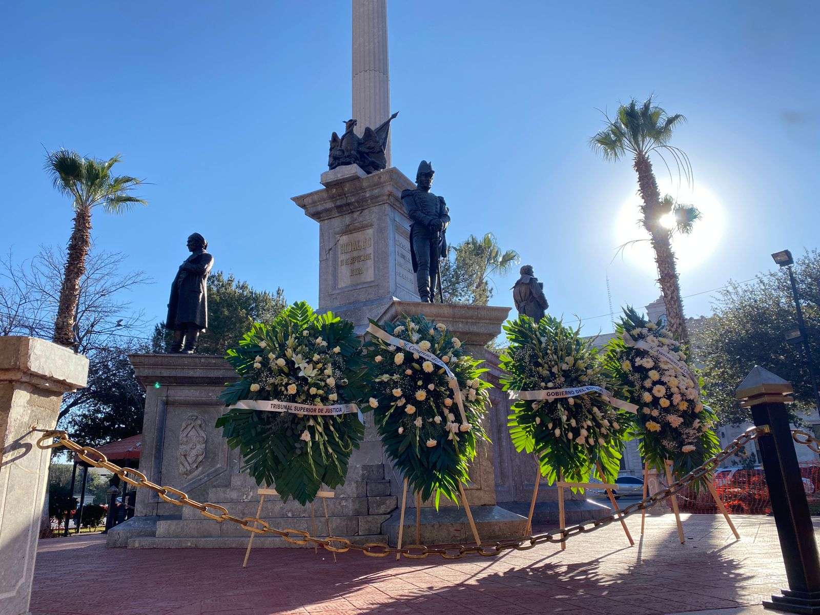 Chihuahua.- La Plaza Hidalgo amaneció este viernes con arreglos florales frente al monumento a Ignacio Allende.