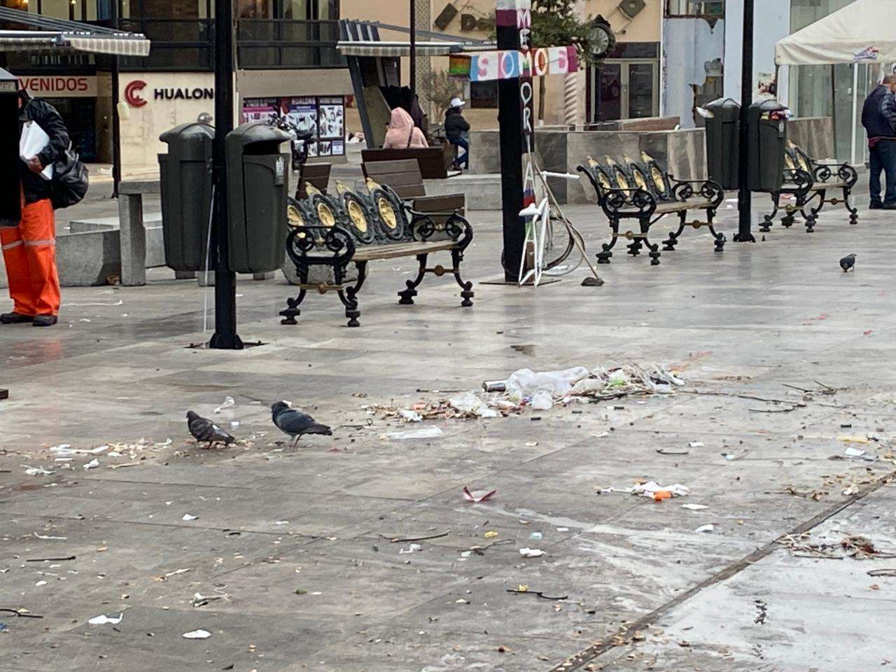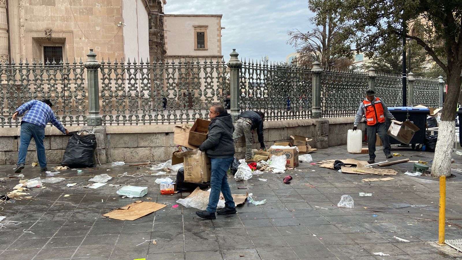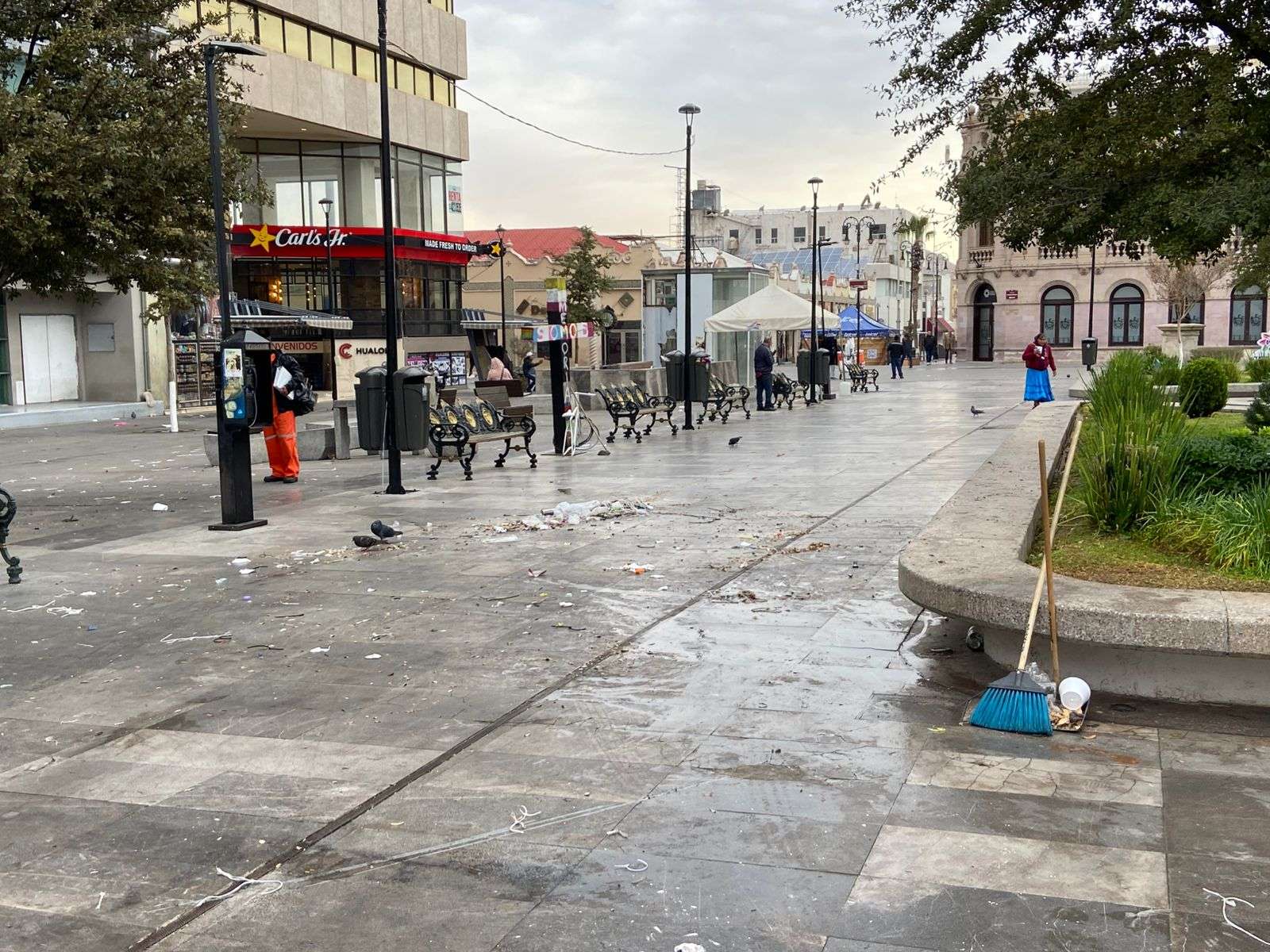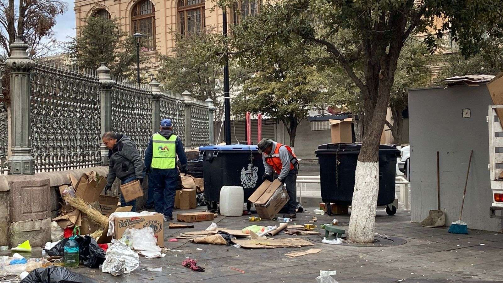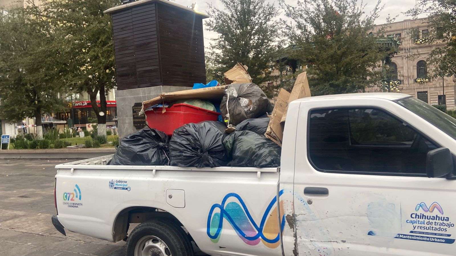 Chihuahua.- Los alrededores de la Plaza de Armas amanecieron llenos de basura tras el retiro de los comerciantes que participaron en la Expo Navidad, lo que generó una contaminación visual para los transeúntes que a diario acuden al centro de la ciudad.