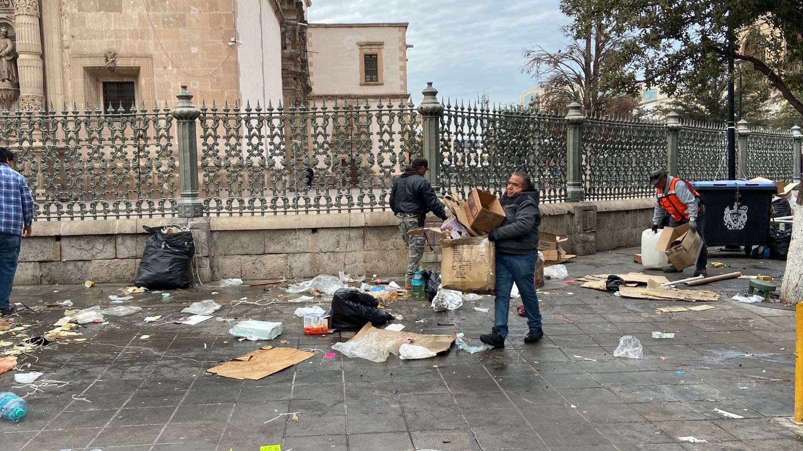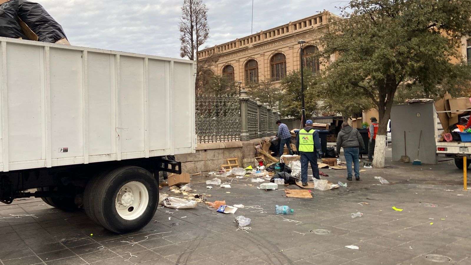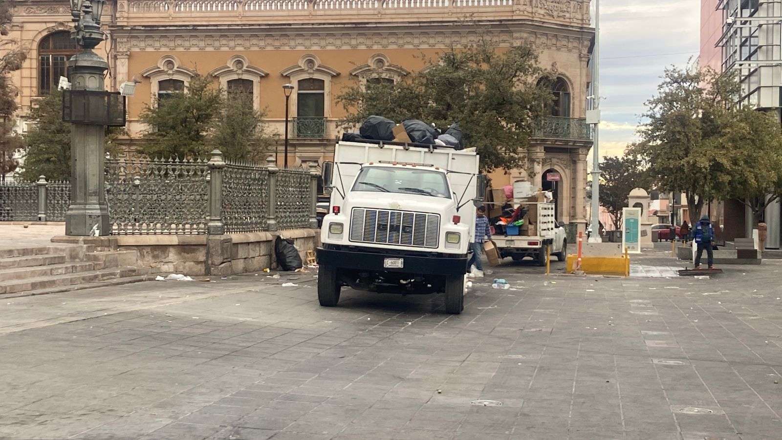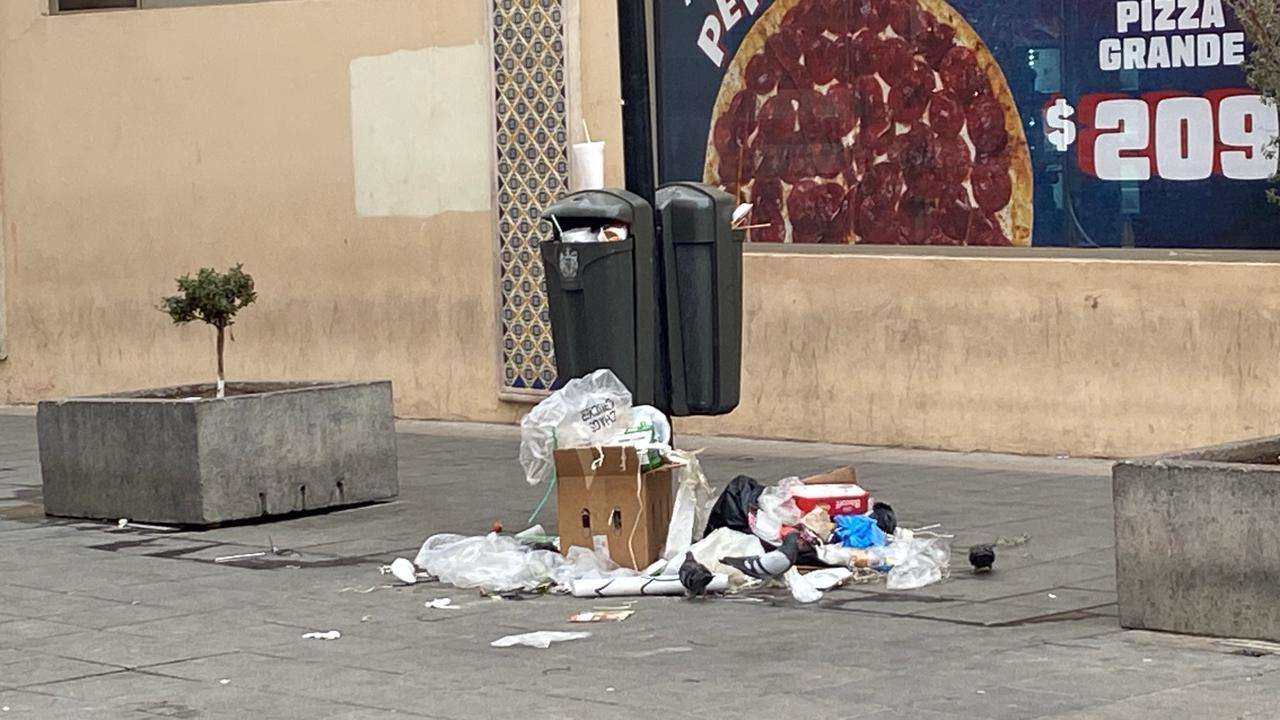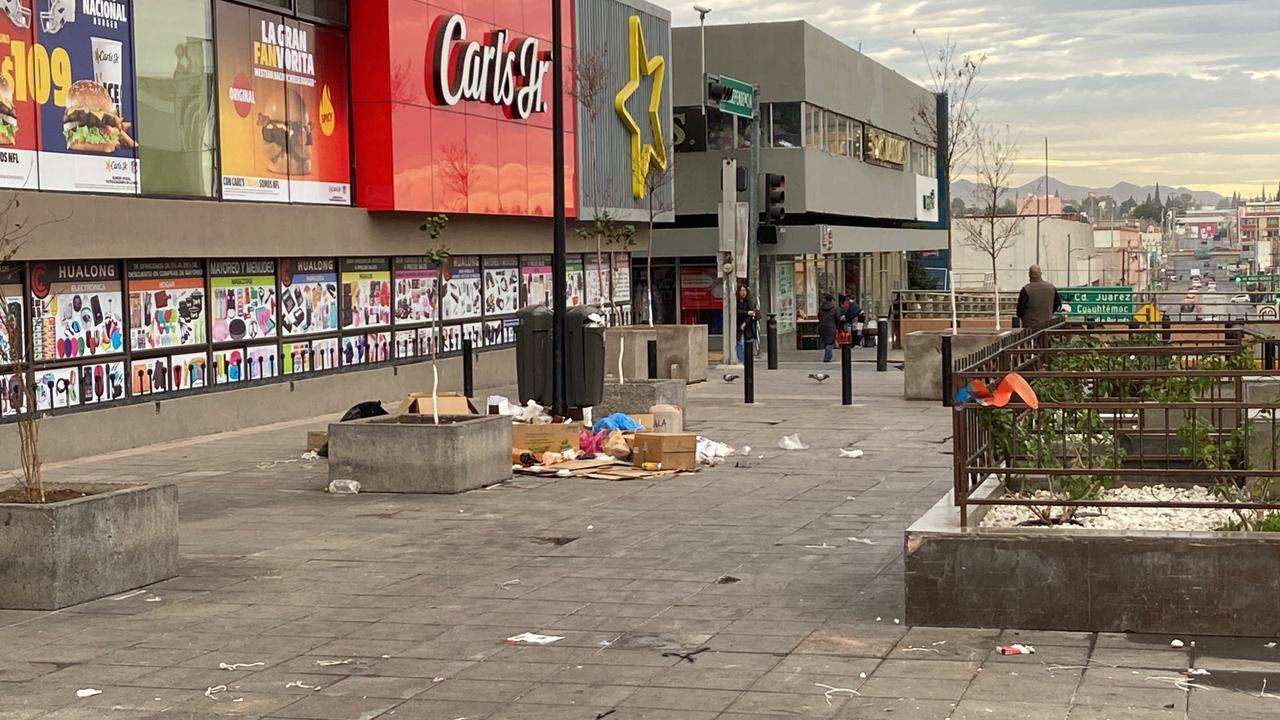 Chihuahua.- Los alrededores de la Plaza de Armas amanecieron llenos de basura tras el retiro de los comerciantes que participaron en la Expo Navidad, lo que generó una contaminación visual para los transeúntes que a diario acuden al centro de la ciudad.