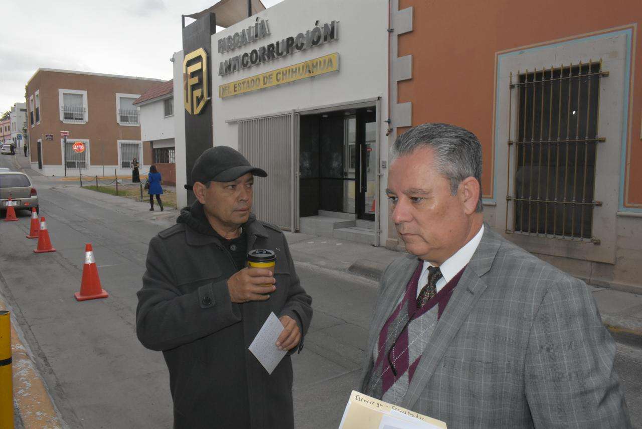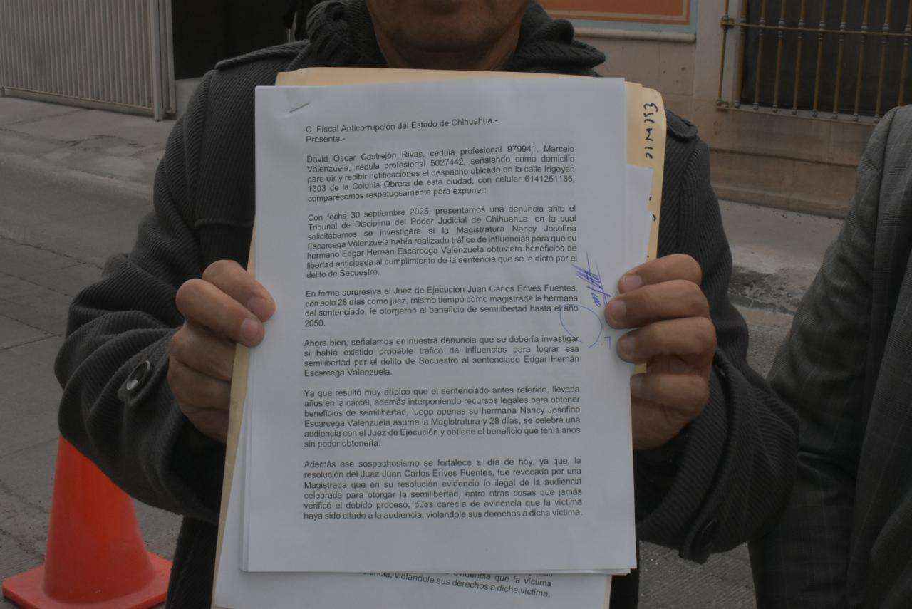 Chihuahua.- El abogado Óscar Castrejón, junto al maestro Marcelo Valenzuela, acudieron este viernes a la fiscalía anticorrupción para formalizar una denuncia que busca esclarecer un posible esquema de tráfico de influencias que involucra a la magistrada Nancy Escárcega y al juez de ejecución de penas, Juan Carlos Erives Fuentes.