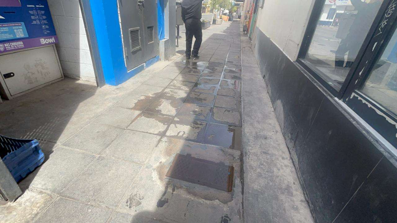 Chihuahua, Chih.- Una grave fuga de agua potable en el corazón de la ciudad ha encendido las alarmas entre transeúntes y comerciantes de la zona centro, quienes denuncian no solo el alarmante desperdicio del recurso, sino el riesgo inminente de un colapso estructural debido a filtraciones en locales aledaños.