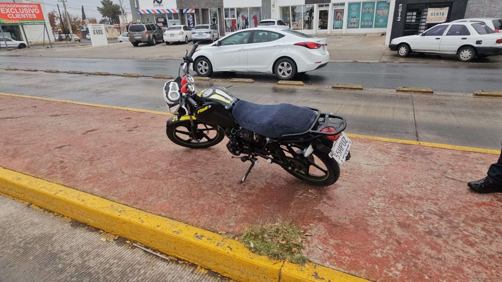 Chihuahua. - Los tripulantes de una motocicleta tipo utilitaria, de la marca Italika, derraparon mientras circulaban sobre la avenida Universidad, a la altura de la calle Arquitectura, debido a las condiciones resbalosas del pavimento, tras las lloviznas registradas en diferentes partes de la ciudad esta tarde.