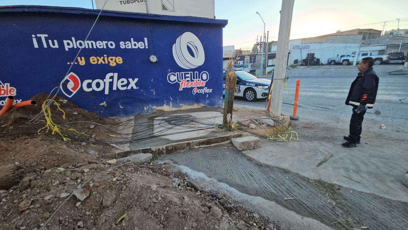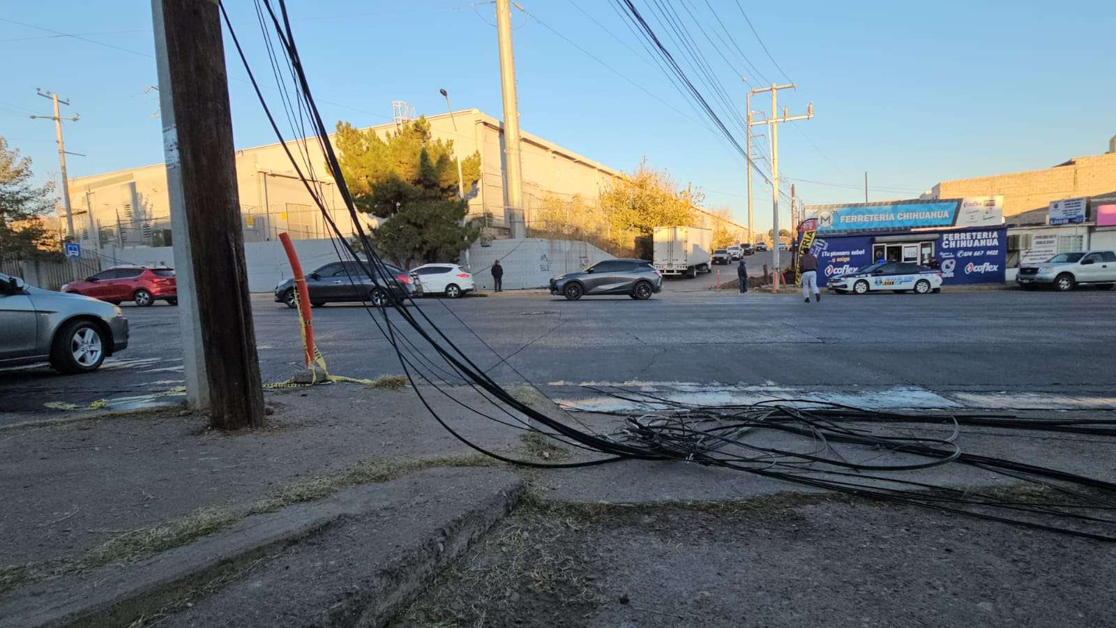 Chihuahua.- Al menos cinco postes de Telmex (Teléfonos de México) fueron derribados por un tráiler luego de que la caja de la unidad se atorara con los cables, en hechos ocurridos en la colonia Diego Lucero, la caída de los postes provocó daños en el servicio de telefonía e internet en la zona.