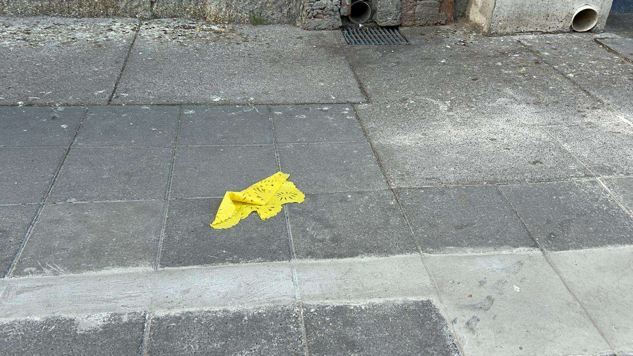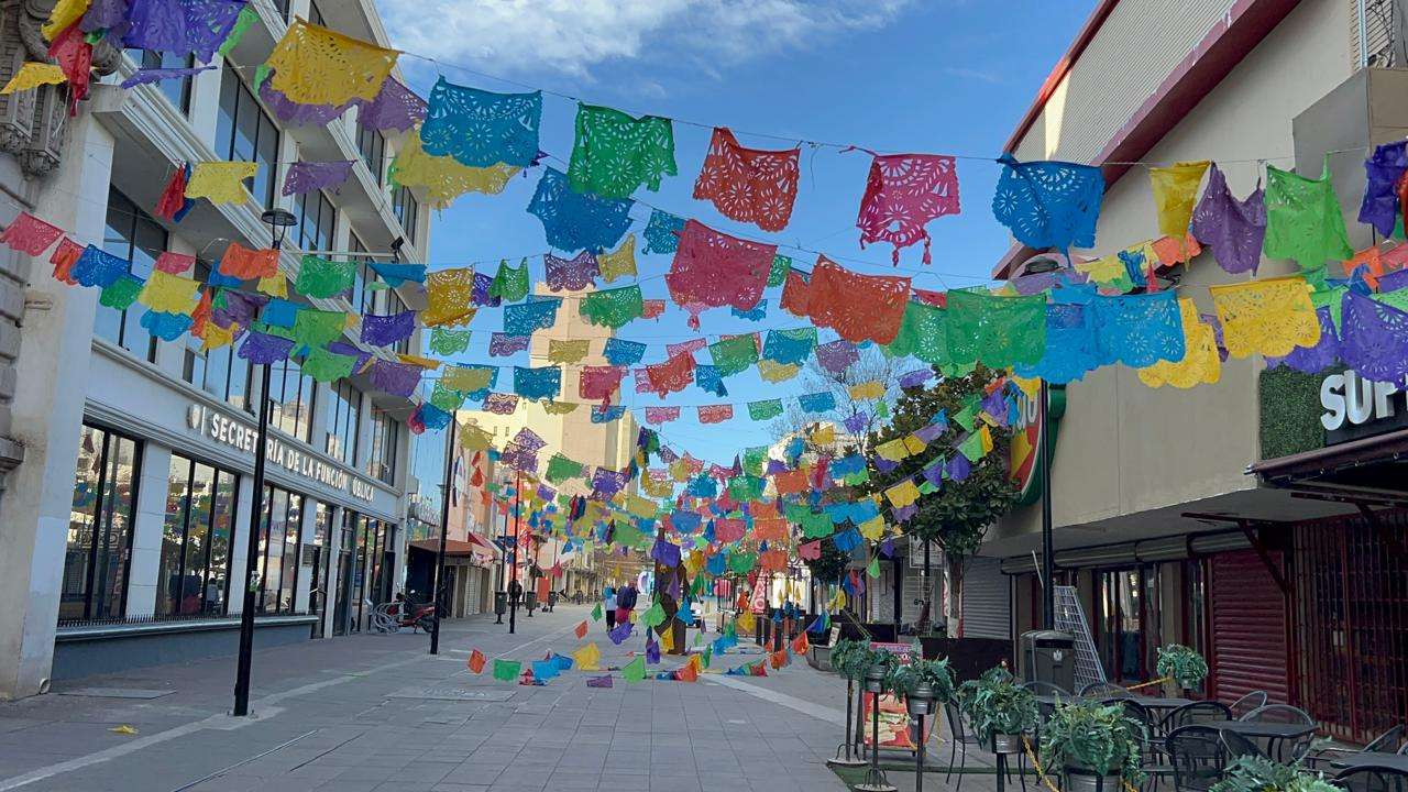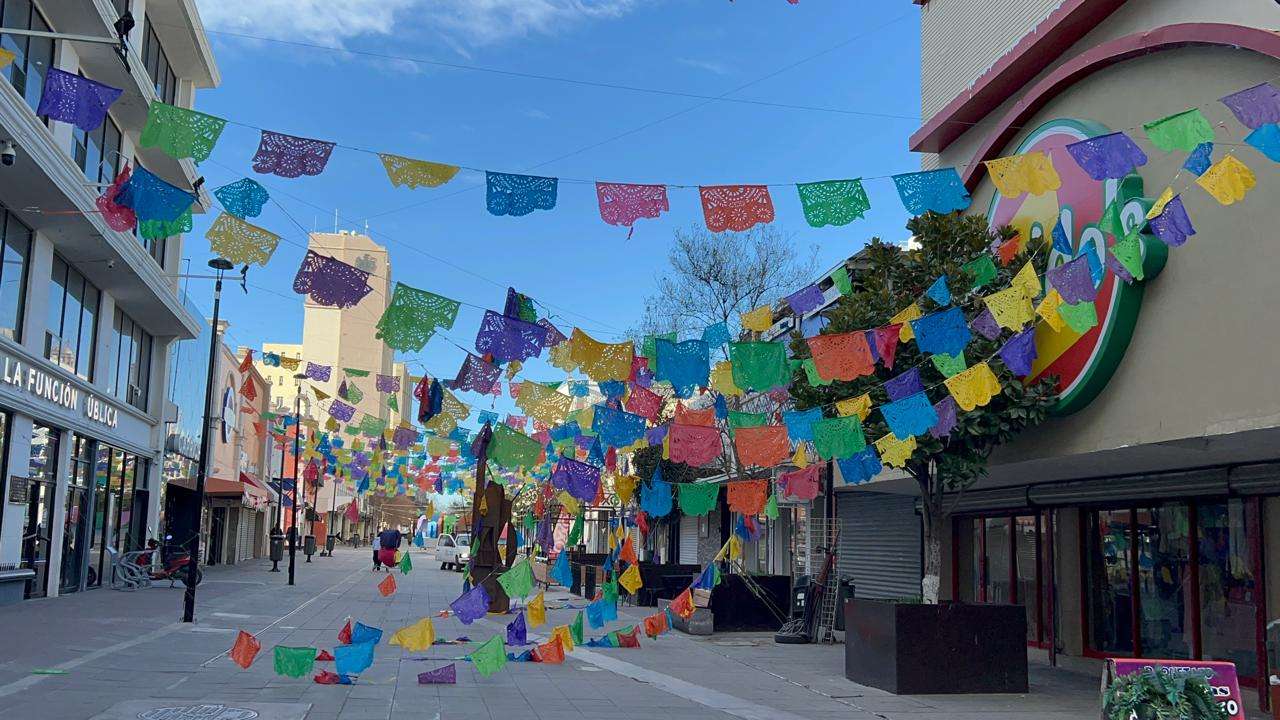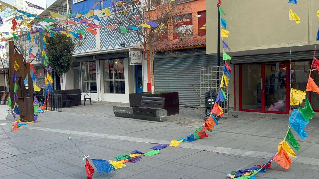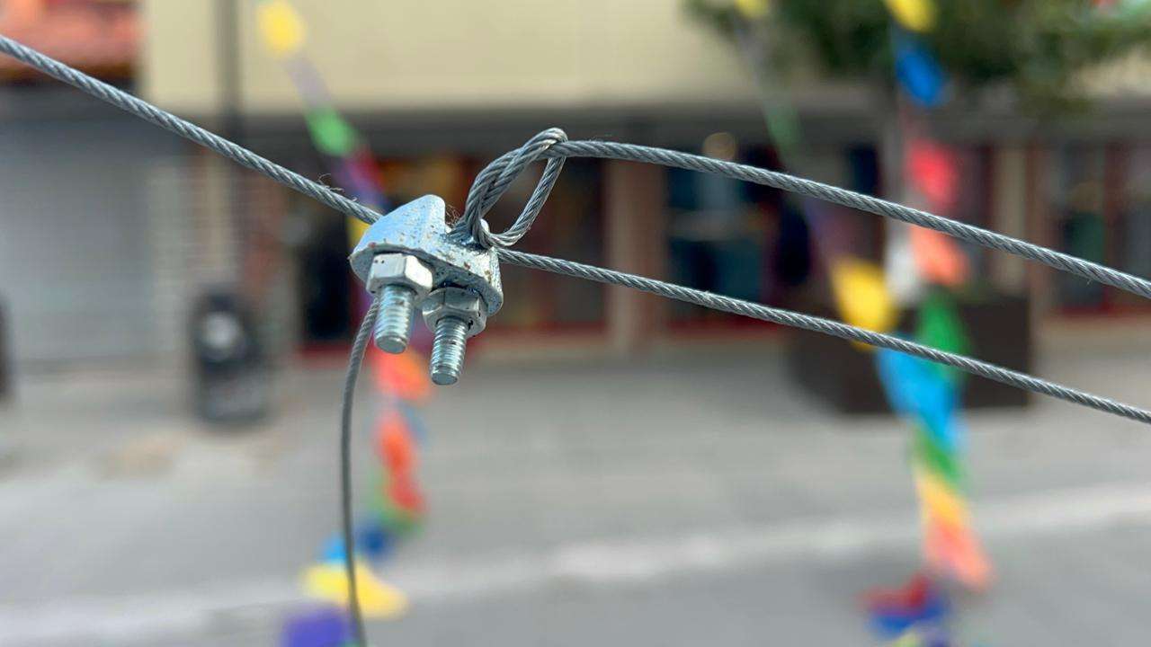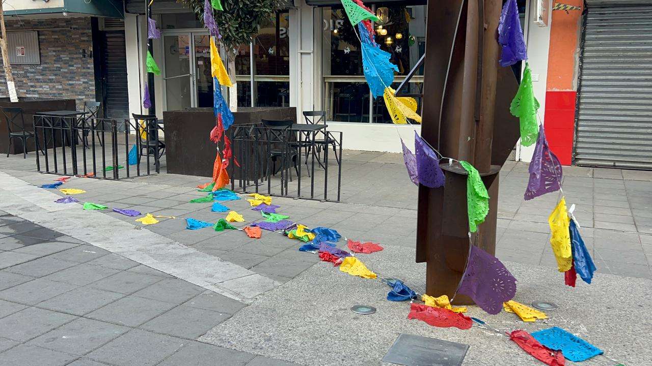 Entre las calles Séptima y Quinta se encontraban varios adornos sujetos a cables de acero que cuelgan hasta el piso, lo que impide el tránsito de los peatones.