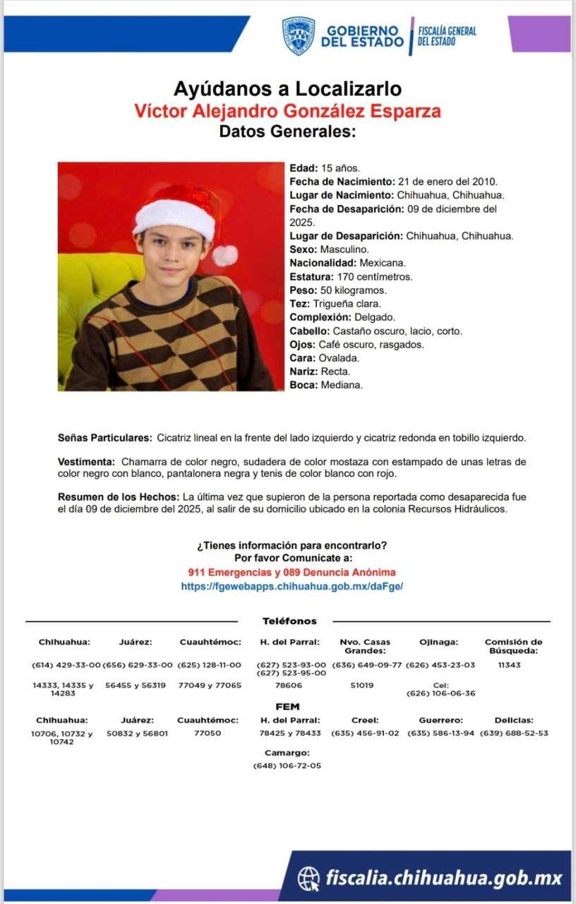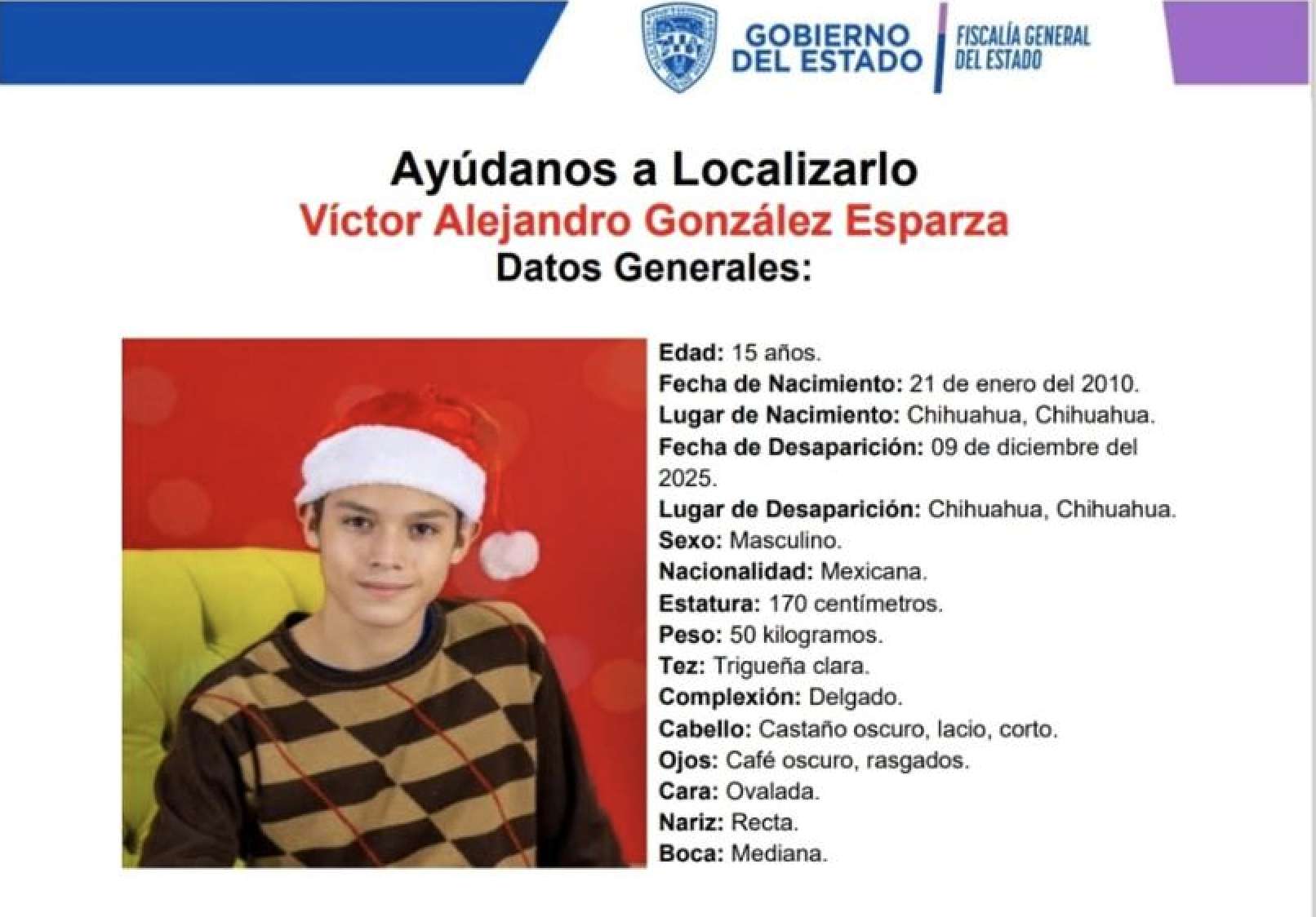 Chihuahua.- Víctor Alejandro González Esparza, de 15 años, desapareció este 9 de diciembre en la ciudad de Chihuahua.