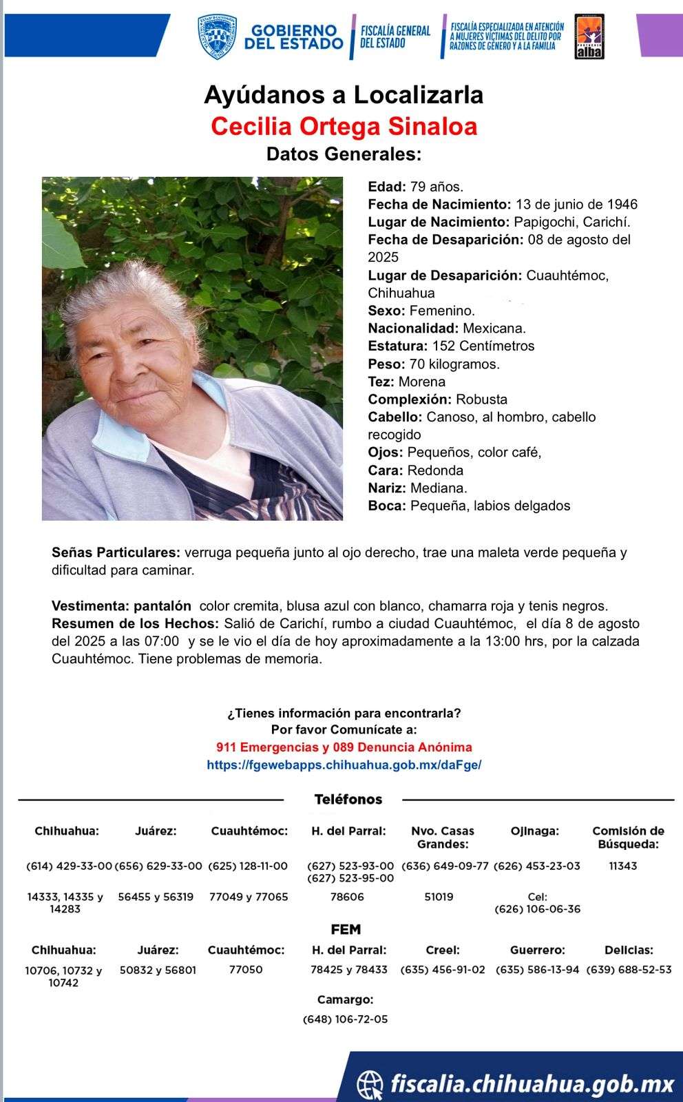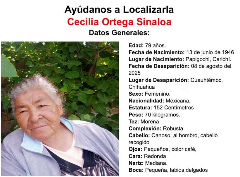 Chihuahua.- Cecilia Ortega Sinaloa, de 79 años, desapareció el pasado 8 de agosto al salir de Carichí rumbo a ciudad Cuauhtémoc.