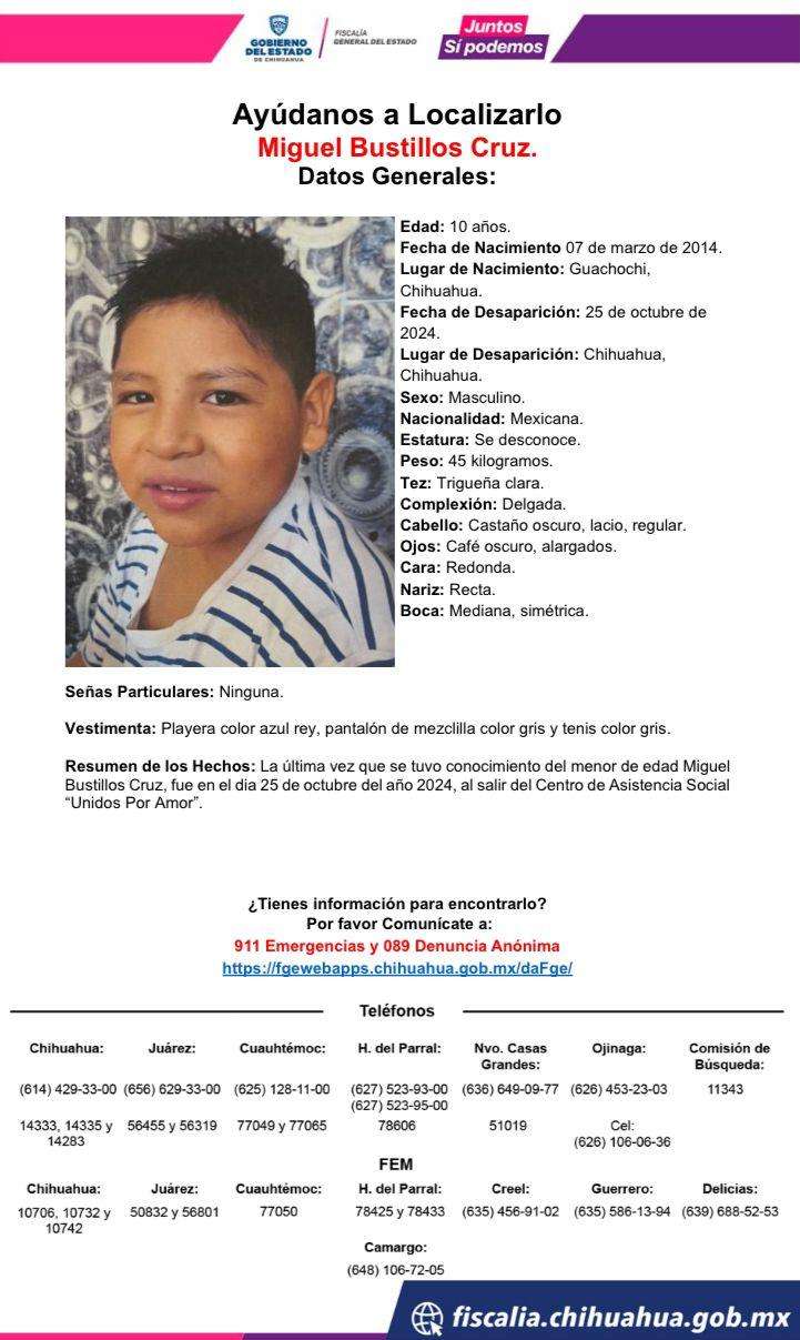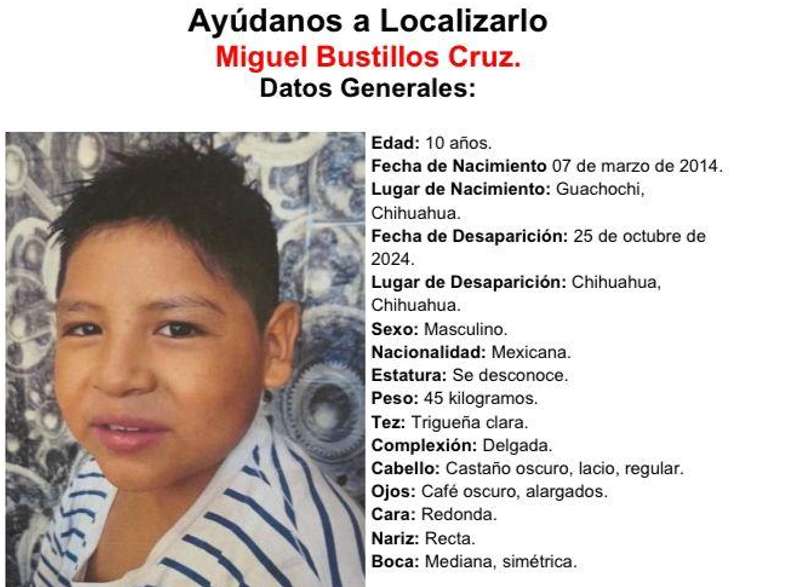 Chihuahua.- El menor Miguel Bustillos Cruz, de 10 años, desapareció desde ayer viernes 25 de octubre, en la ciudad de Chihuahua.