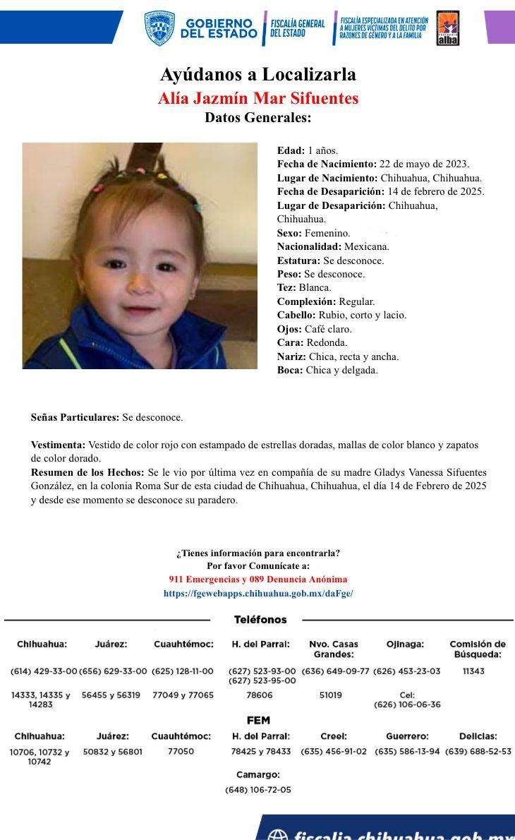 Chihuahua.- Gladys Vanessa Sifuentes González, de 29 años, y su bebita de un año, Alía Jazmín Mar Sifuentes, desaparecieron desde ayer viernes 14 de febrero en la ciudad de Chihuahua.
