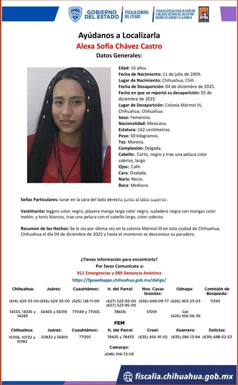 Una de las menores ausentes se llama Alexa Sofía Chávez Castro de 16 años, desapareció ayer en la colonia Mármol etapa III.
