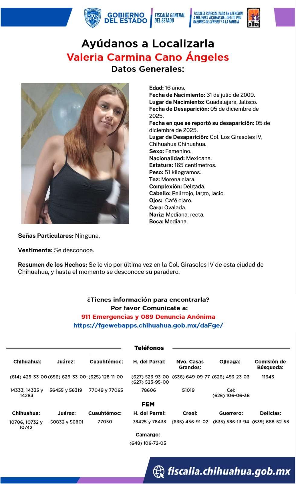 La otra menor ausente se llama Valeria Carmina Cano Ángeles, de 16 años, desapareció hoy en la colonia Los Girasoles, etapa IV.