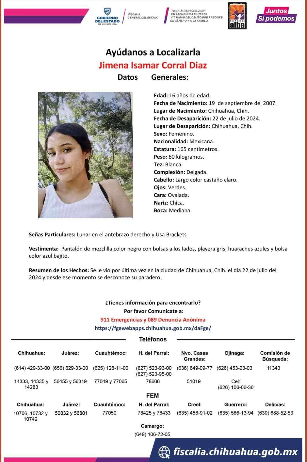 - Jimena Isamar Corral Díaz. De vestimenta blusa color gris, pantalón negro con bolsas en los lados de mezclilla, huaraches color azul claro, mide aproximadamente 1.67 m., tez blanca, ojos color verde y brackets.