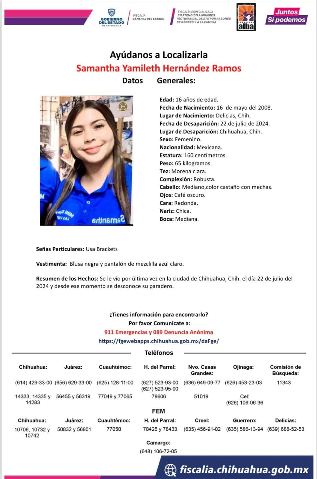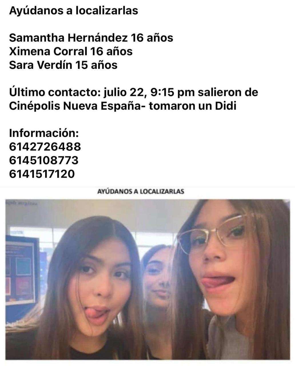 Chihuahua.- Las autoridades y familiares están buscando a tres adolescentes desaparecidas, identificadas como Samantha Yamileth Hernández Ramos (16 años), Jimena Isamar Corral Díaz (16 años) y Zara Verdin Mendoza (15 años) fueron vistas por última vez el lunes 22 de julio a las 9:15 p.m. cuando salieron del Cinépolis ubicado en la Vialidad Ch-p y Av. Nueva España.