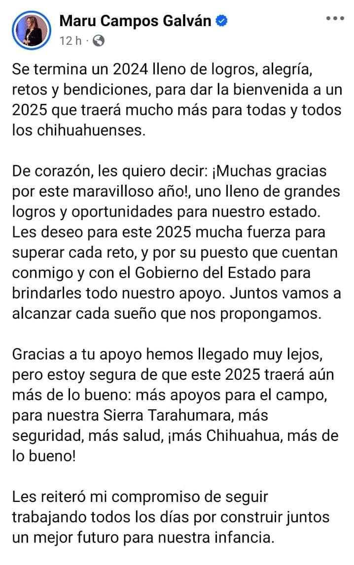 "Se termina un 2024 lleno de logros, alegrías, retos y bendiciones, para dar la bienvenida a un 2025 que traerá mucho más para todas y todos los chihuahuenses.