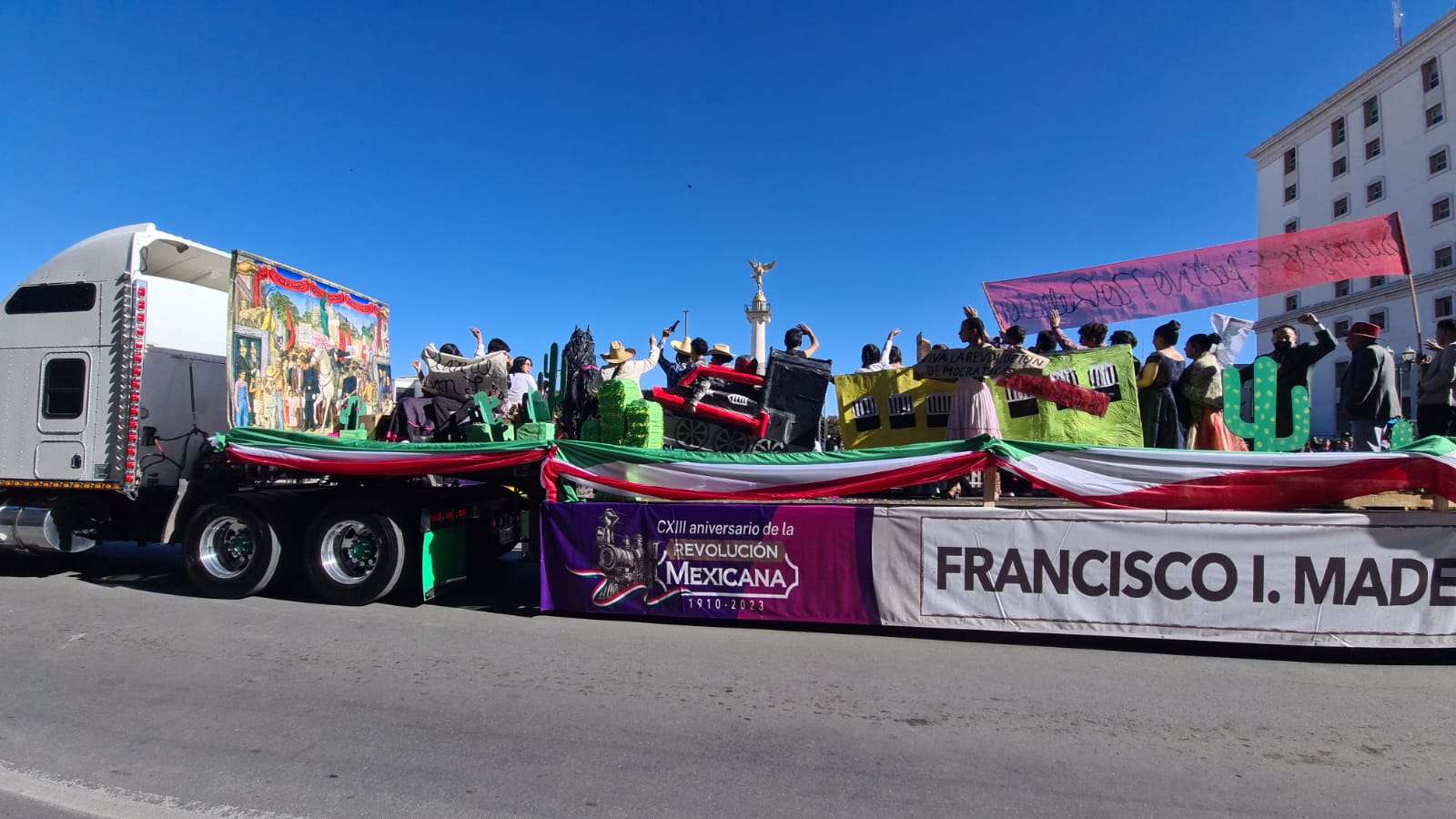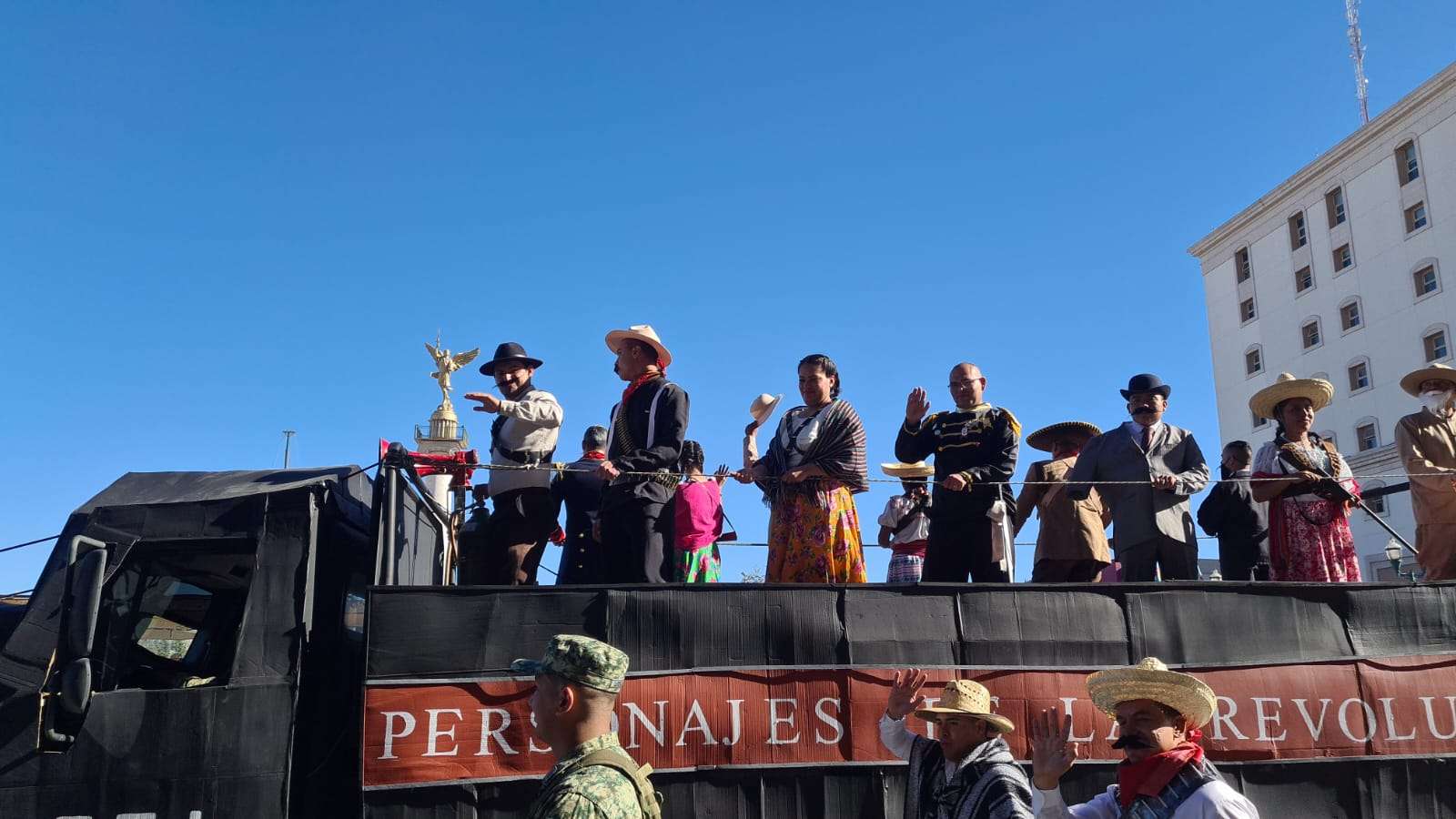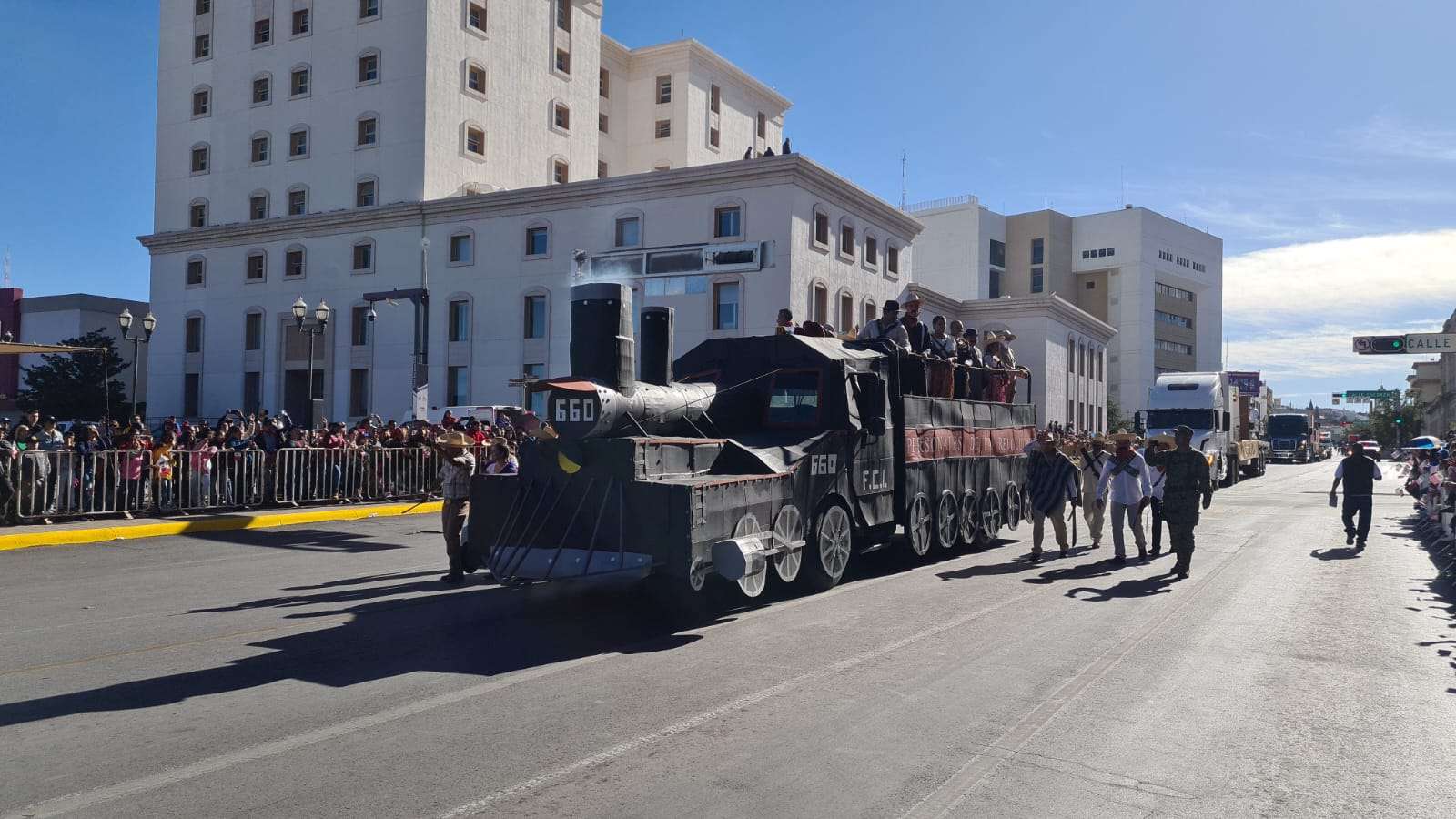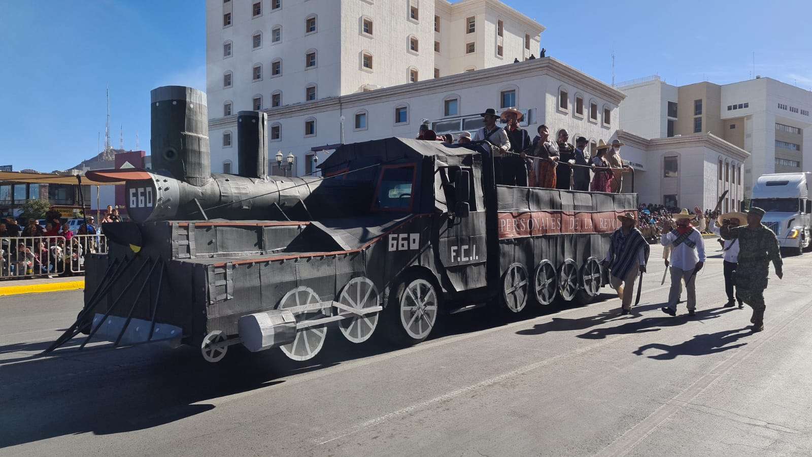 Ante el presídium hijos y descendientes de grandes revolucionarios a bordo de un hermoso carro alegórico en forma de tren desfilaron frente a los miles de asistentes que se congregaron en el centro de la ciudad.