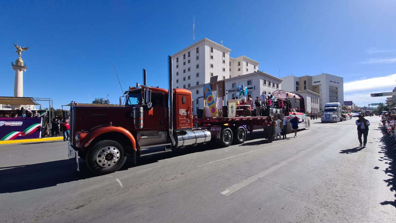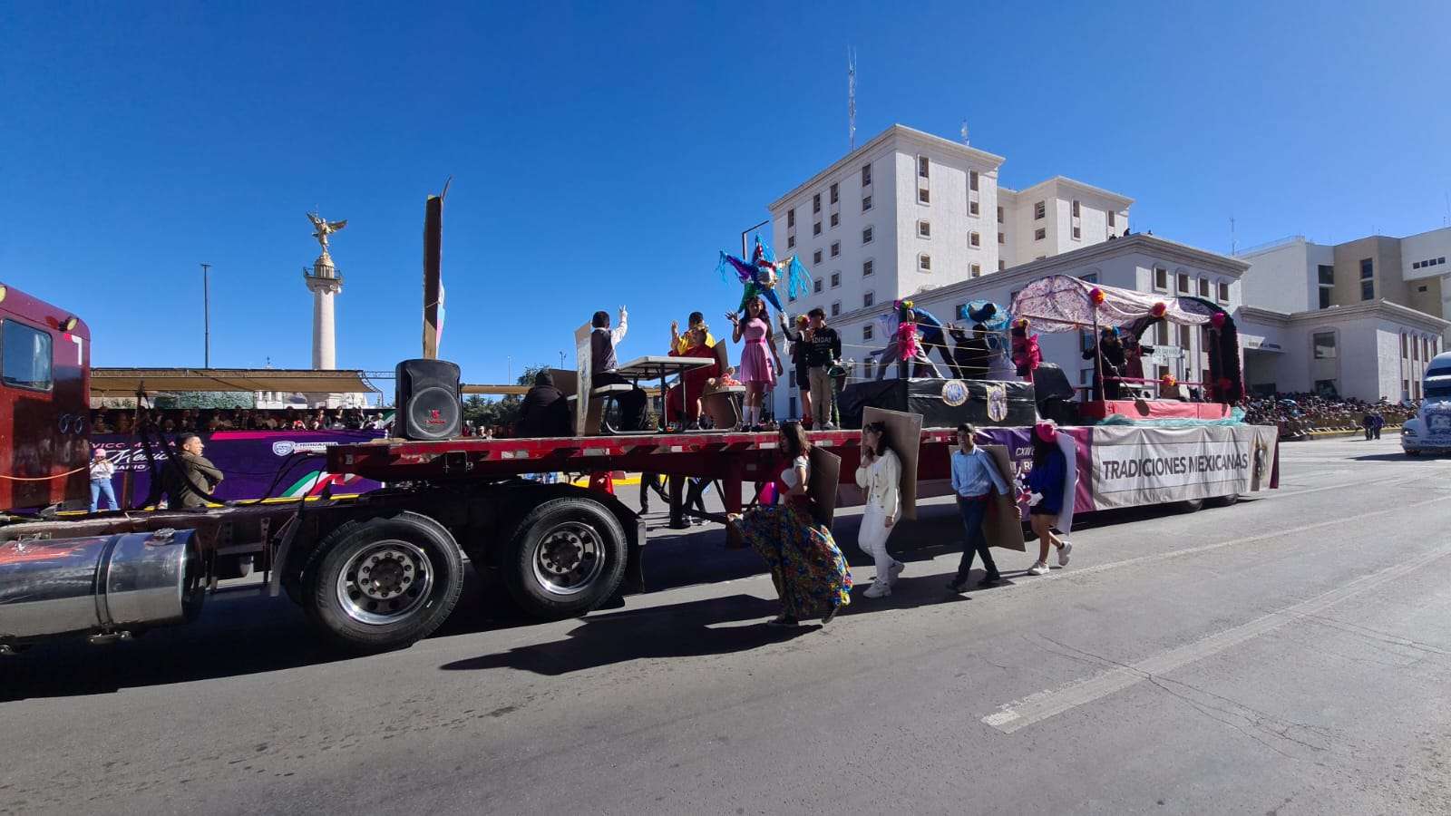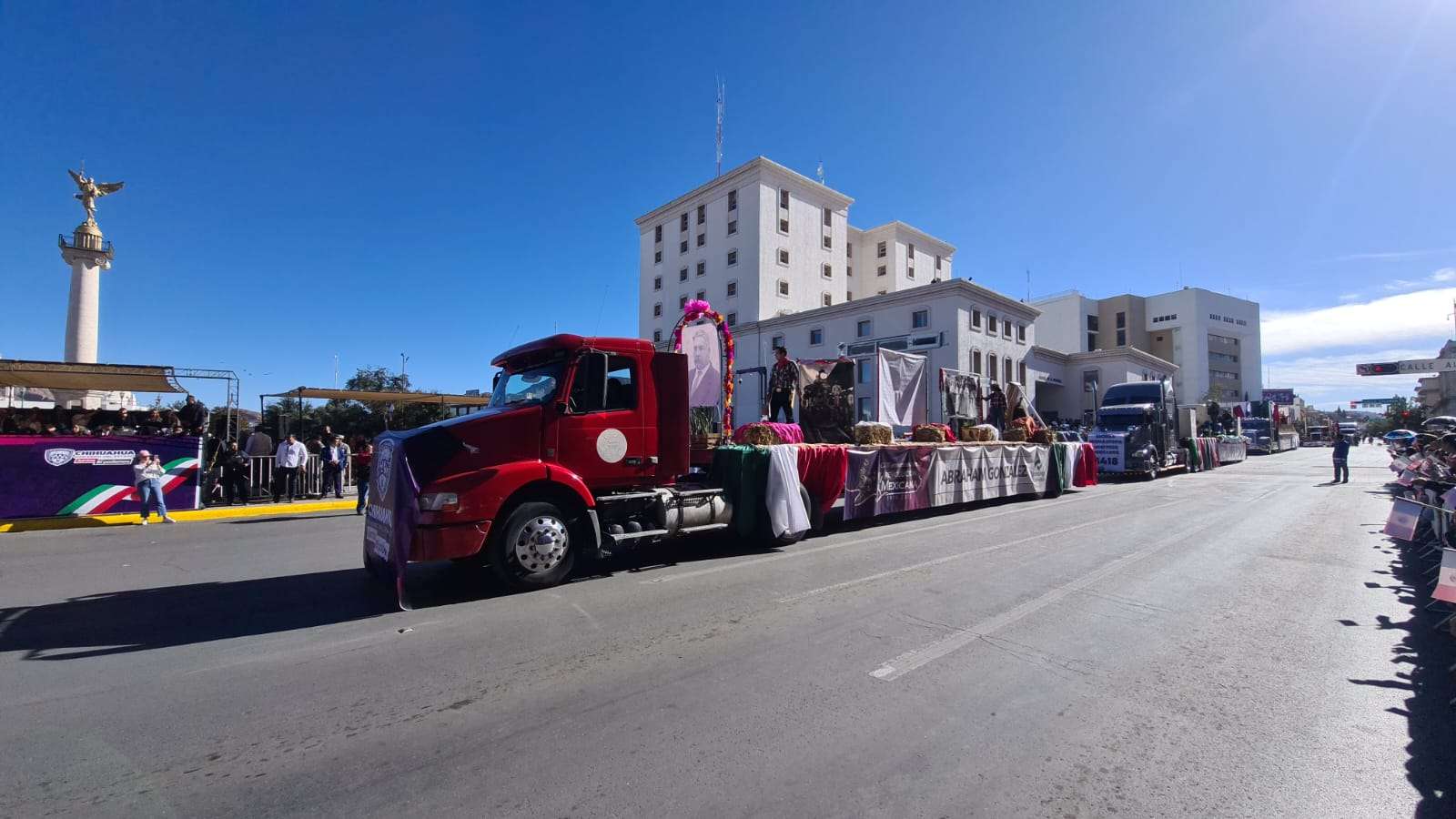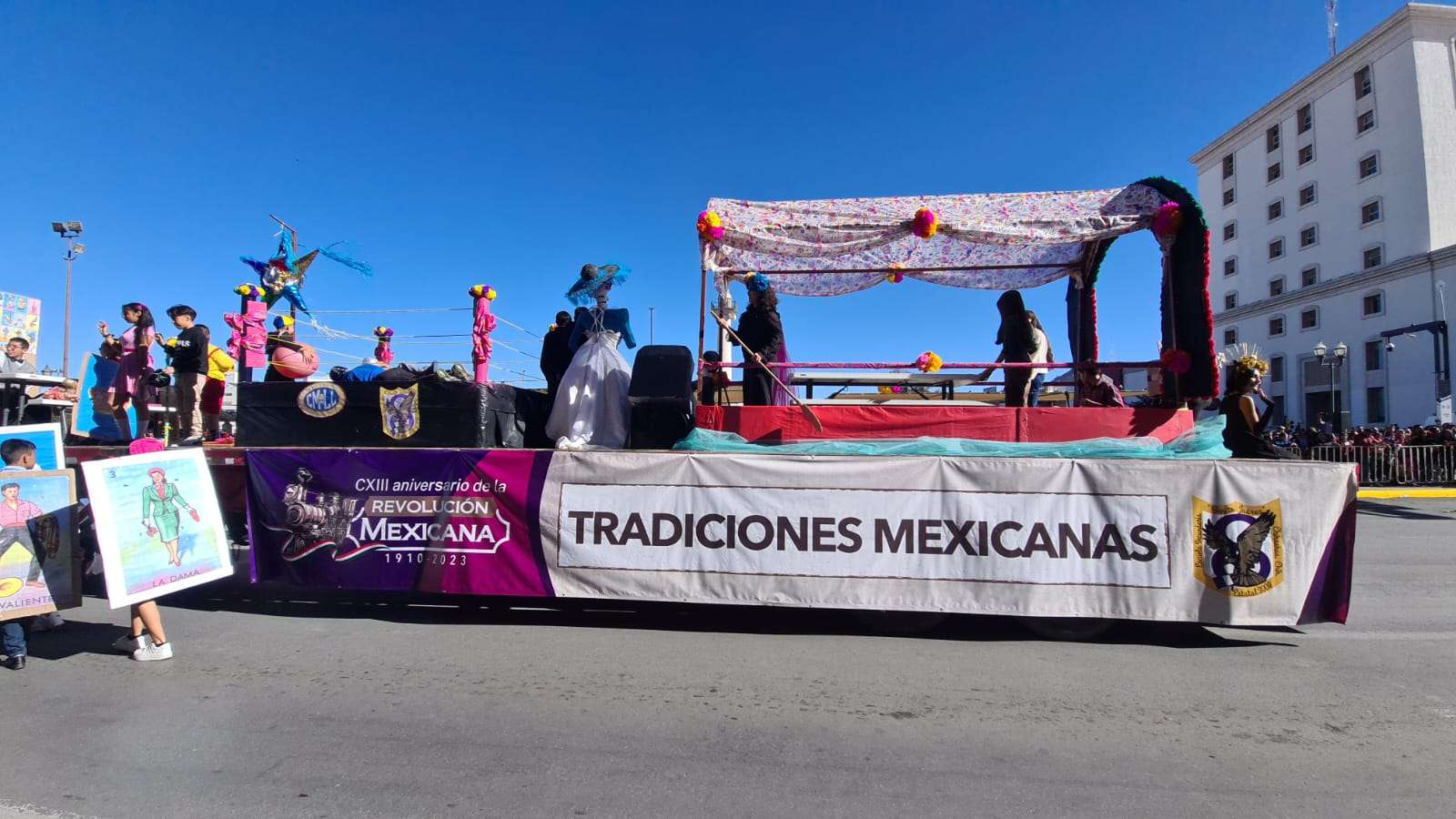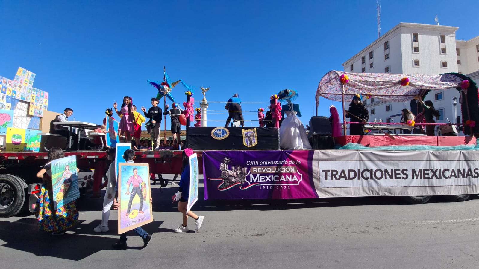 Ante el presídium hijos y descendientes de grandes revolucionarios a bordo de un hermoso carro alegórico en forma de tren desfilaron frente a los miles de asistentes que se congregaron en el centro de la ciudad.