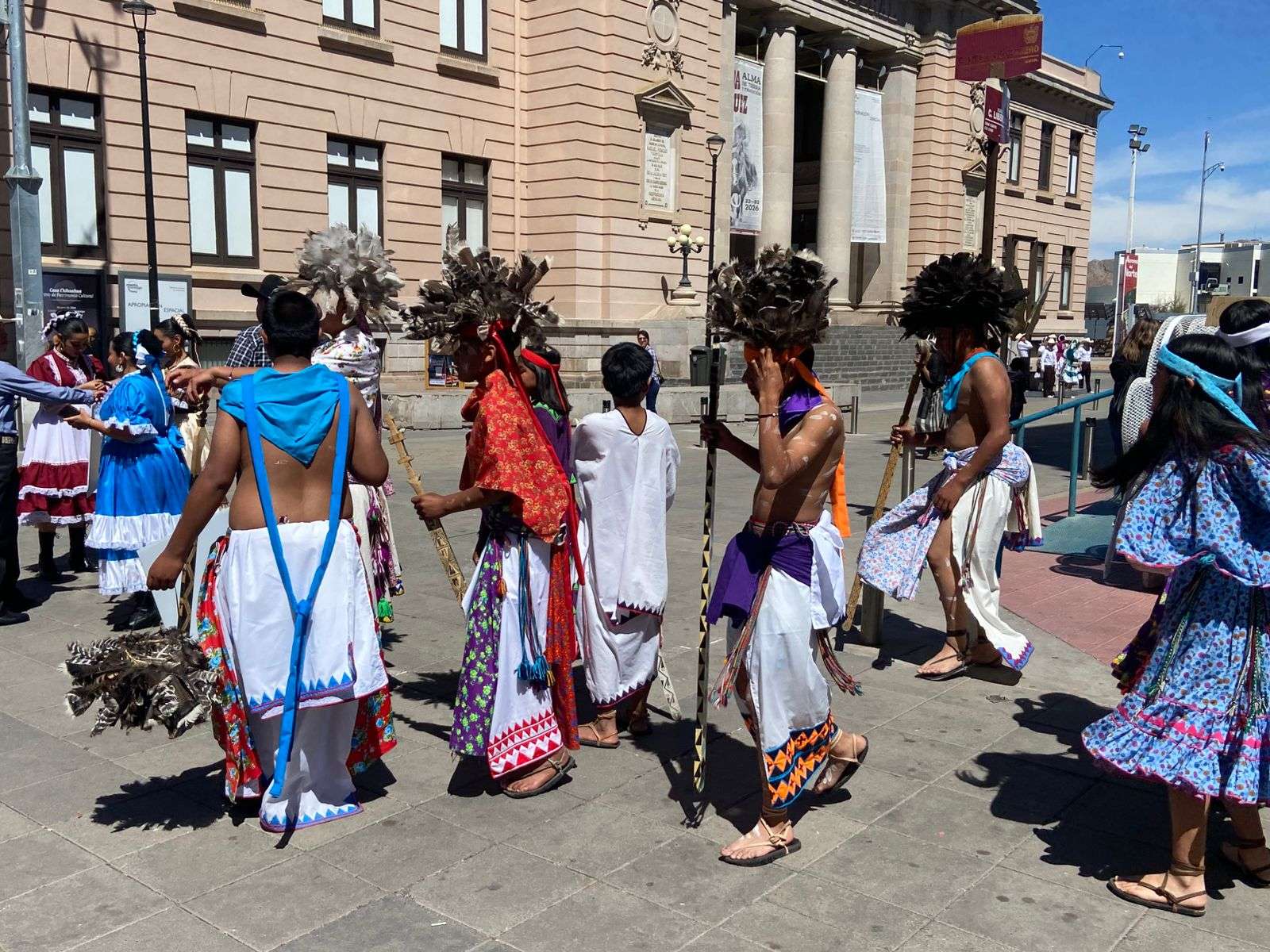 Chihuahua.- Un ambiente festivo y lleno de música inundó las calles del centro de la capital con el desfile de más de 70 grupos de danza que participaron en el Festival Folclórico en la Plaza de Armas.