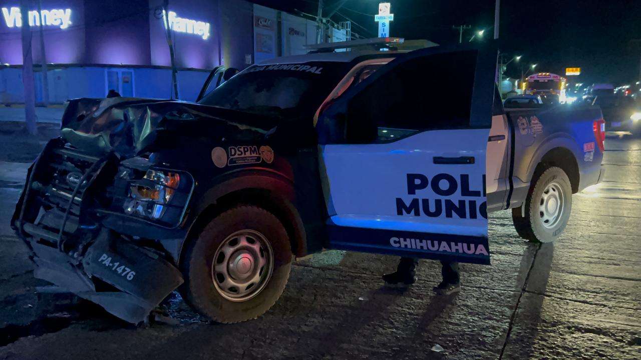 Chihuahua.- Un agente de la Policía Municipal resultó con heridas de consideración luego de impactar la patrulla que conducía contra un vehículo particular.