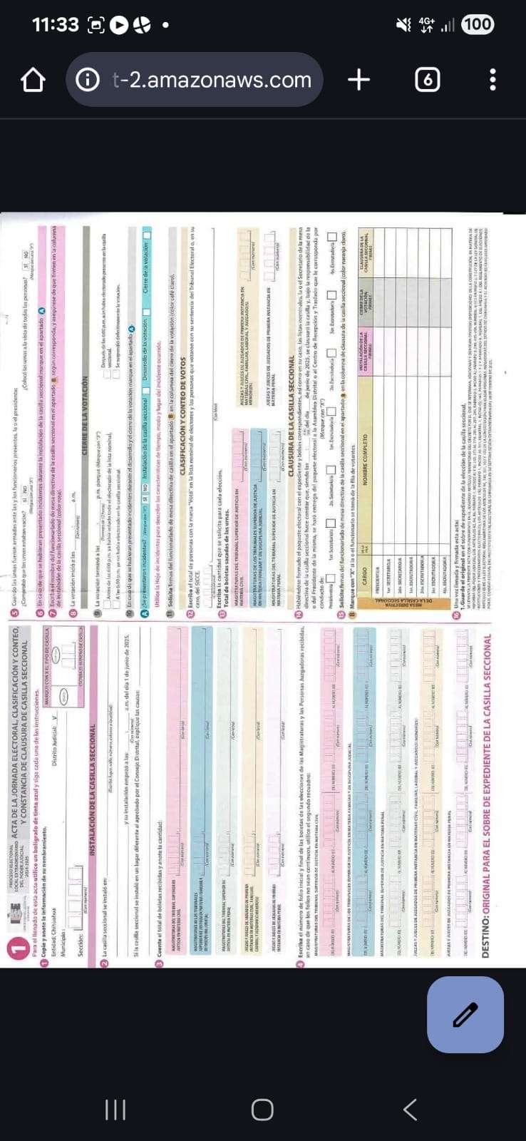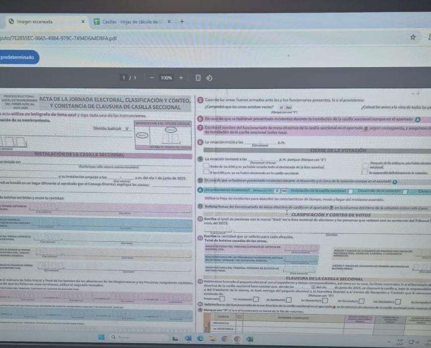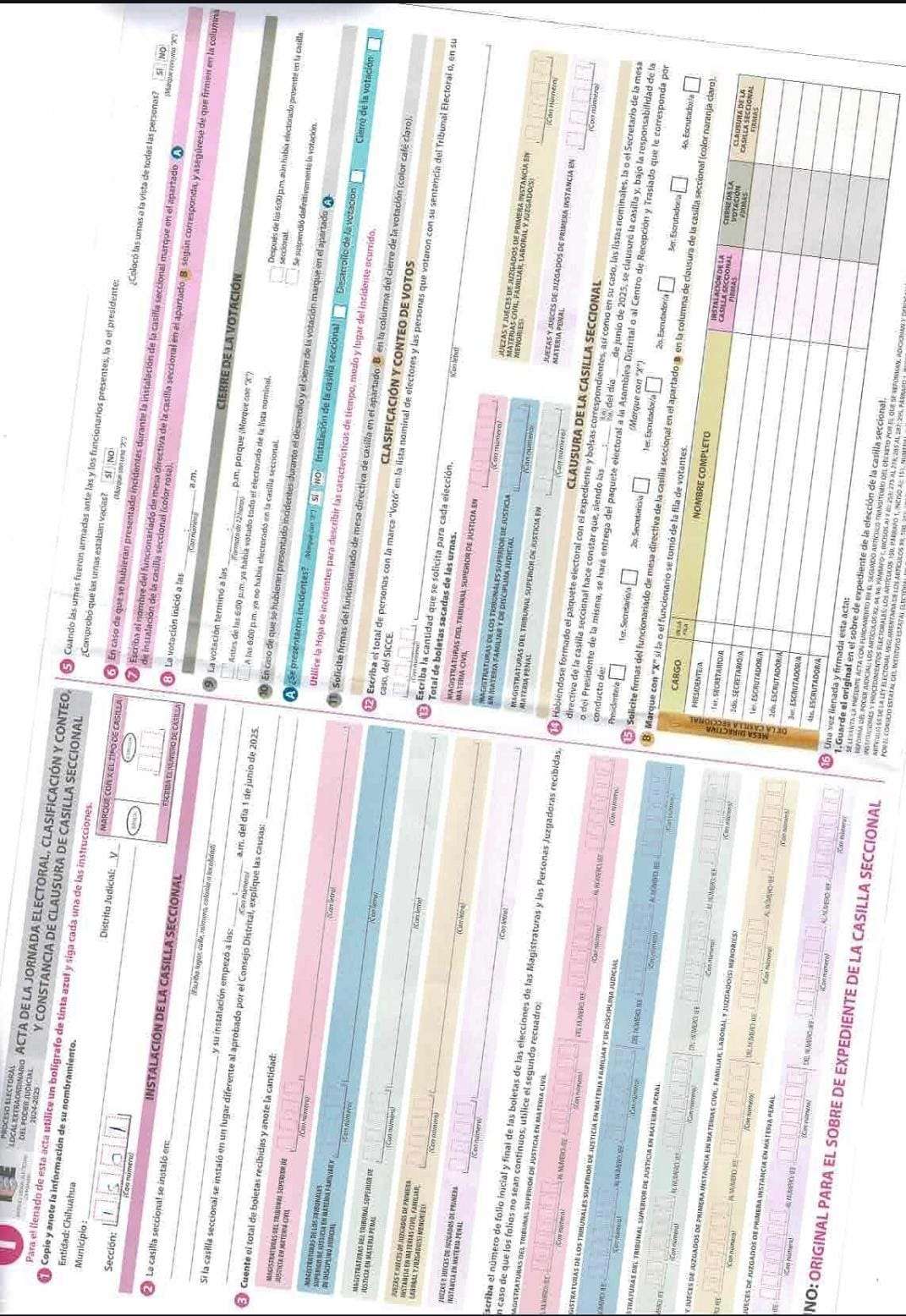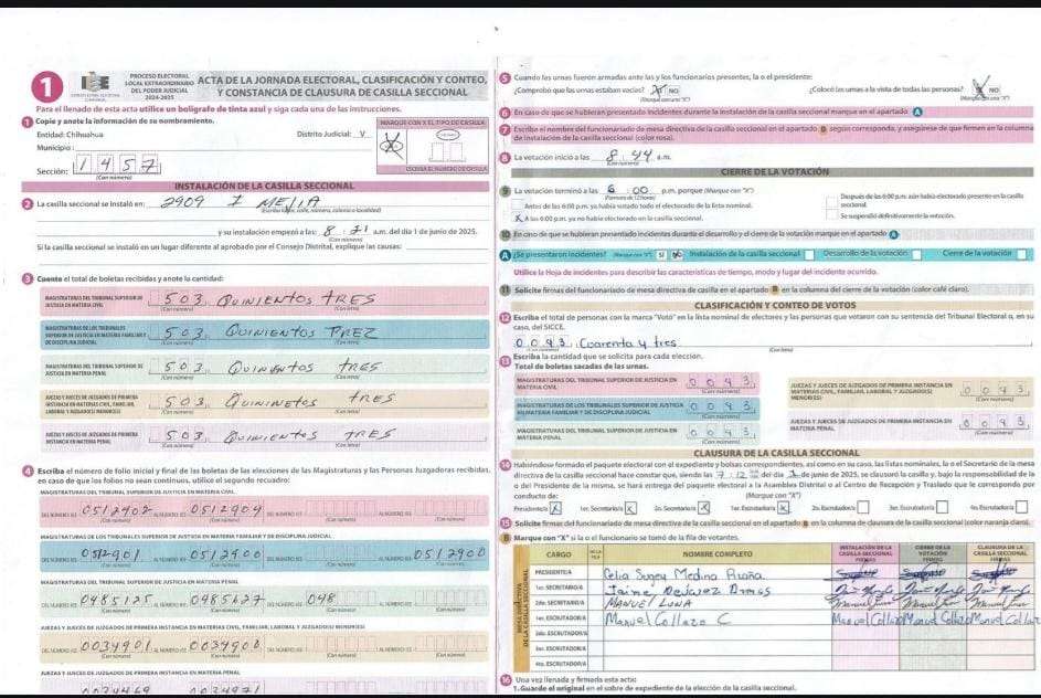 Chihuahua.— Durante la jornada electoral reciente relacionada con la elección de integrantes del Poder Judicial, se detectó una posible irregularidad en la Asamblea de Ciudad Juárez, donde se habrían publicado actas de escrutinio y cómputo completamente en blanco, correspondientes a las secciones 1501 y 1458, entre otras.