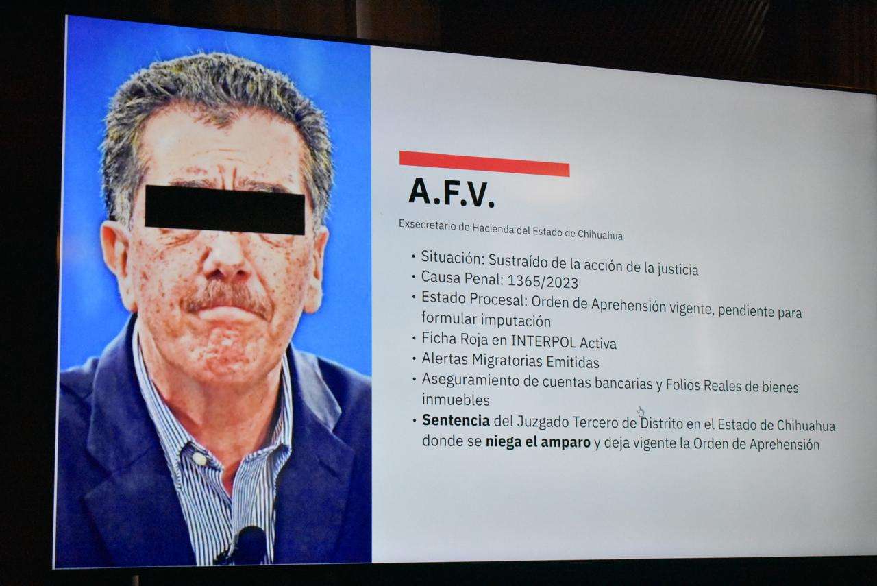 “Hace unas horas se nos notificó una nueva orden de aprehensión contra el exsecretario de Hacienda, A.F.V., por el delito de peculado agravado, correspondiente a la causa penal número 17, por el desvío de 243 millones 207 mil 242 pesos del erario, en perjuicio del Gobierno del Estado”, declaró Valenzuela.