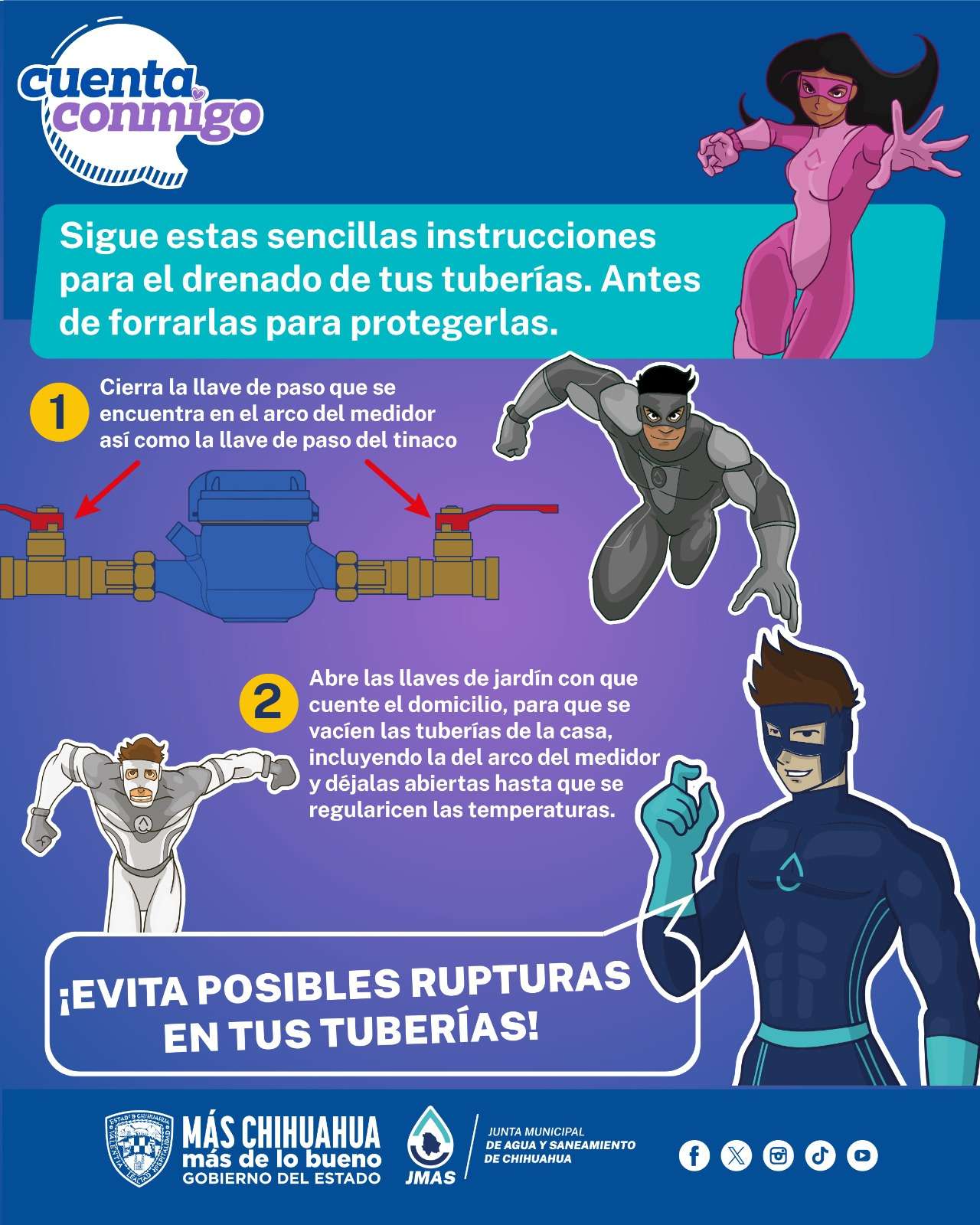 Chihuahua, Chih.- Ante el pronóstico de bajas temperaturas, la Junta Municipal de Agua y Saneamiento (JMAS) de Chihuahua emitió recomendaciones para proteger las tuberías y prevenir daños por congelamiento.