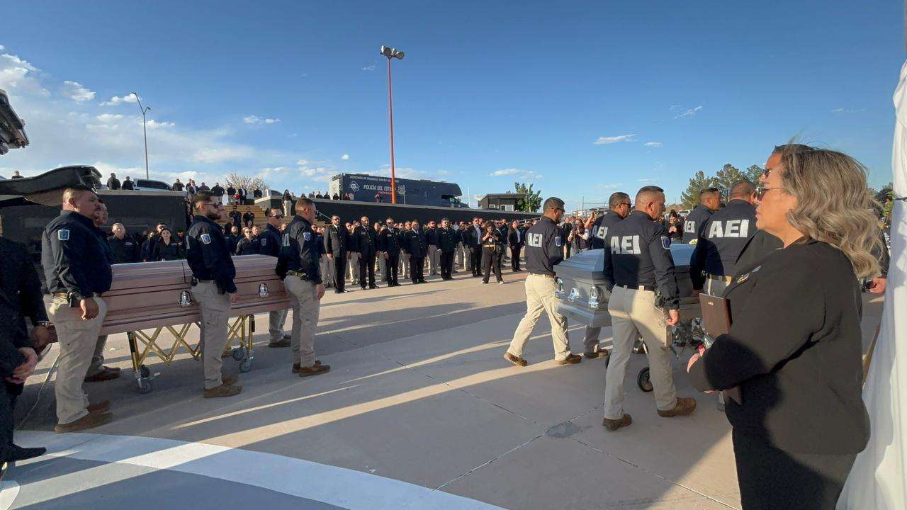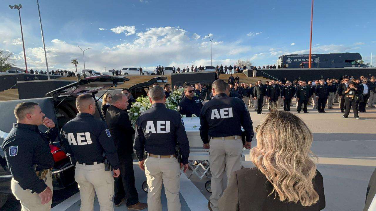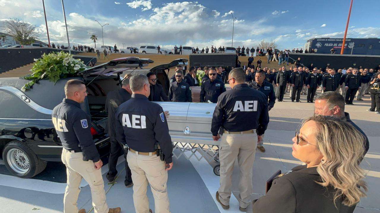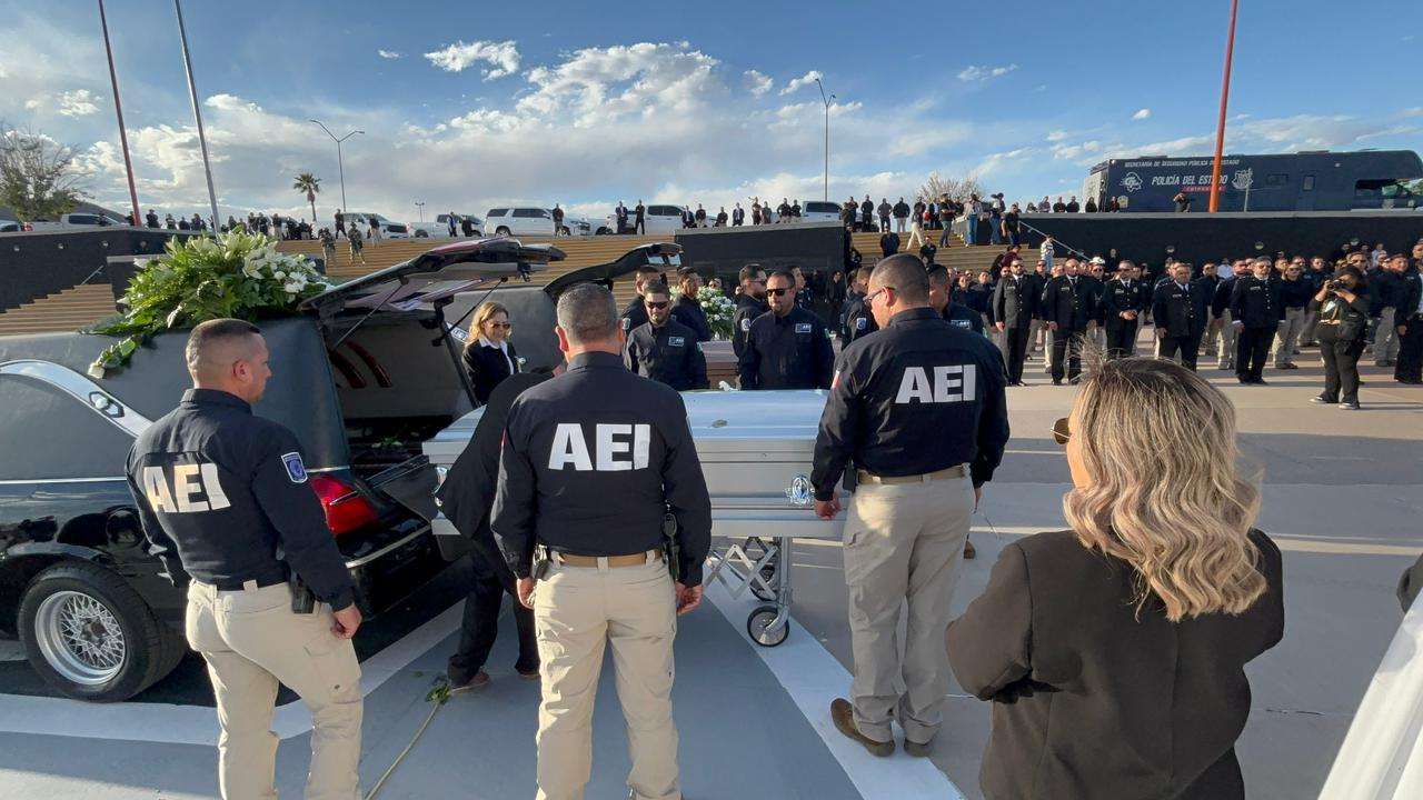 Chihuahua.- La tarde de este lunes, la gobernadora Maru Campos, acompañada por el fiscal general César Jáuregui y el alcalde capitalino Marco Antonio Bonilla Mendoza, encabezó la ceremonia de honras fúnebres en memoria de Pedro Román Oseguera Cervantes, director de la Agencia Estatal de Investigación (AEI), y del oficial Manuel Genaro Méndez Montes.
