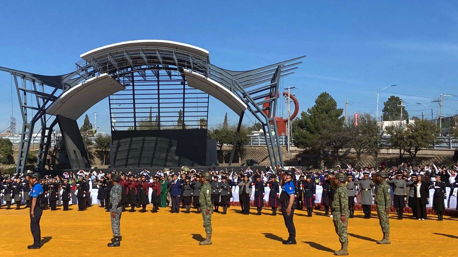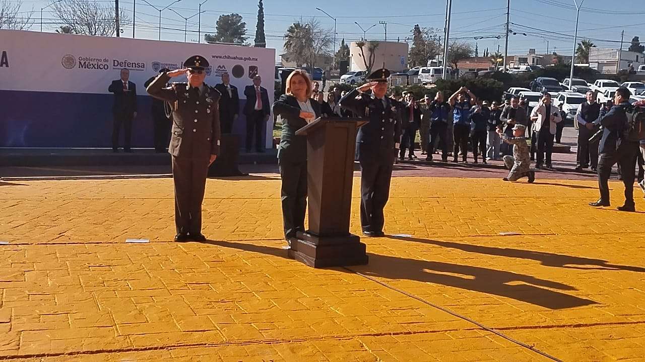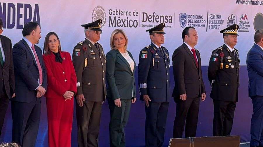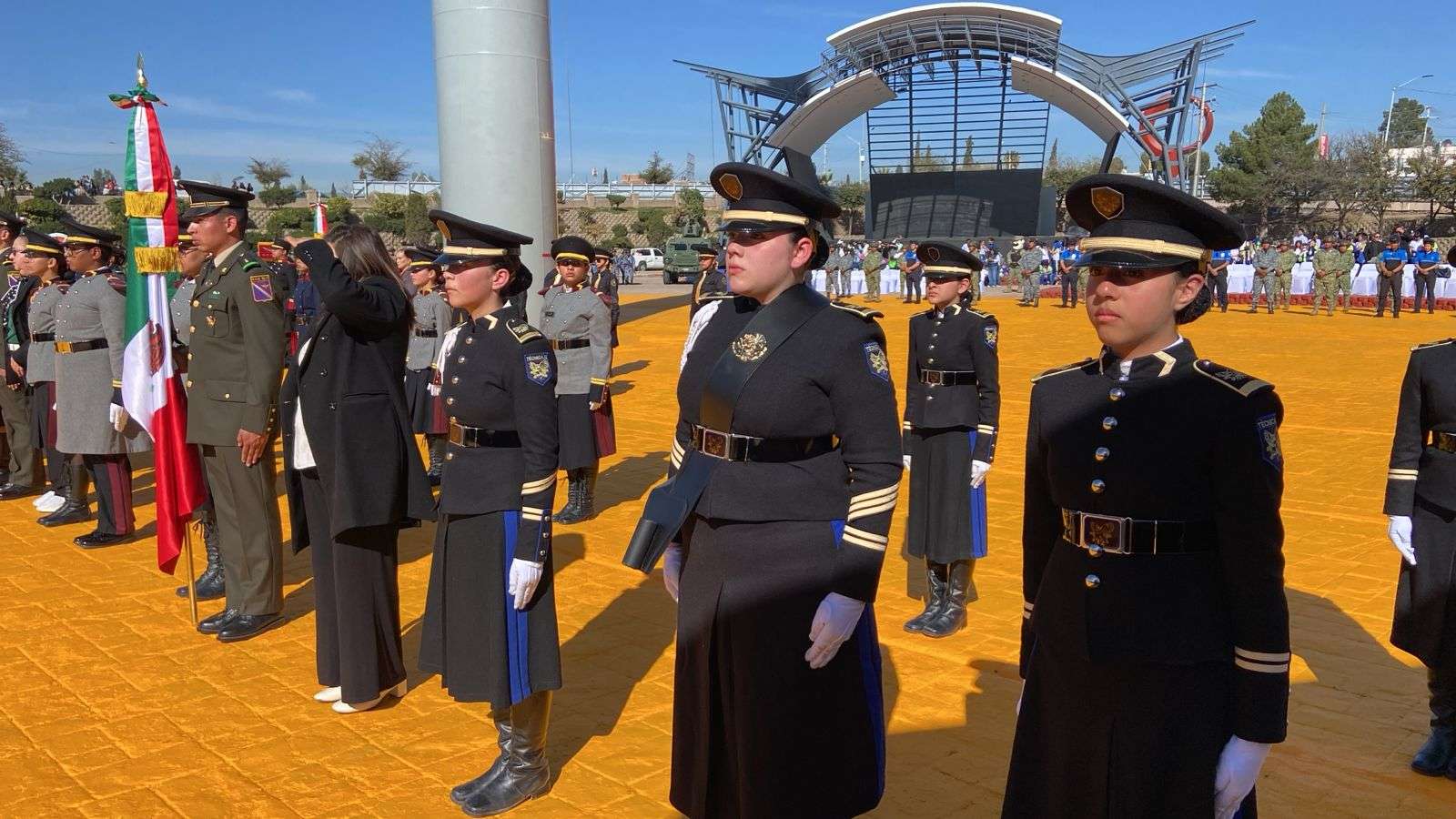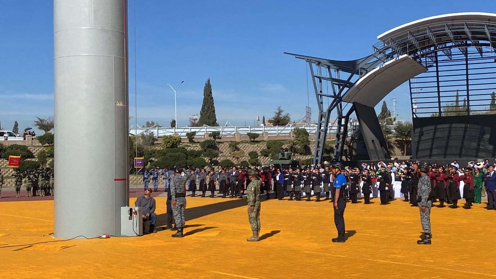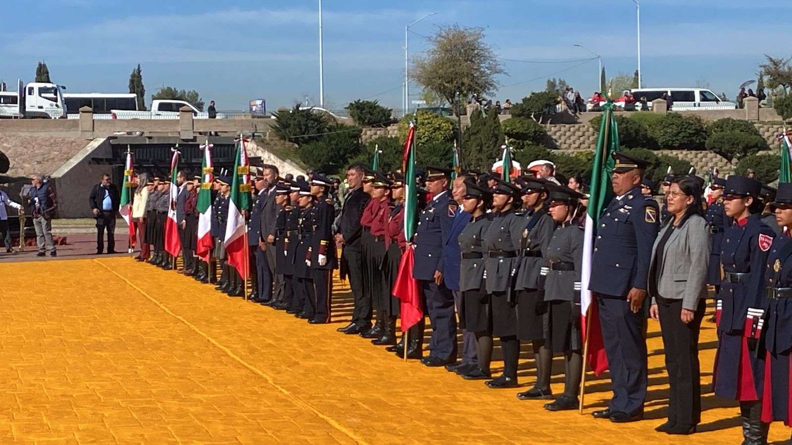La gobernadora, junto con elementos de la Sedena, se encargó de izar la bandera en el asta del Palomar, mientras que la banda de música del Gobierno del Estado interpretó el toque de bandera.