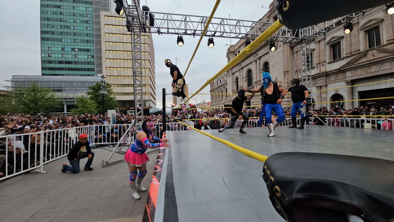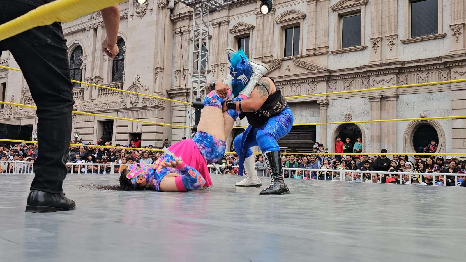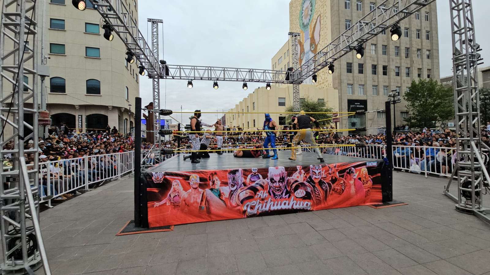 Chihuahua.- La pasión de la lucha libre mexicana se apoderó por completo de la Plaza de Armas este domingo, donde rudos y técnicos contendieron en una caída sin límites de tiempo que mantuvo al filo del asiento a cientos de familias chihuahuenses.