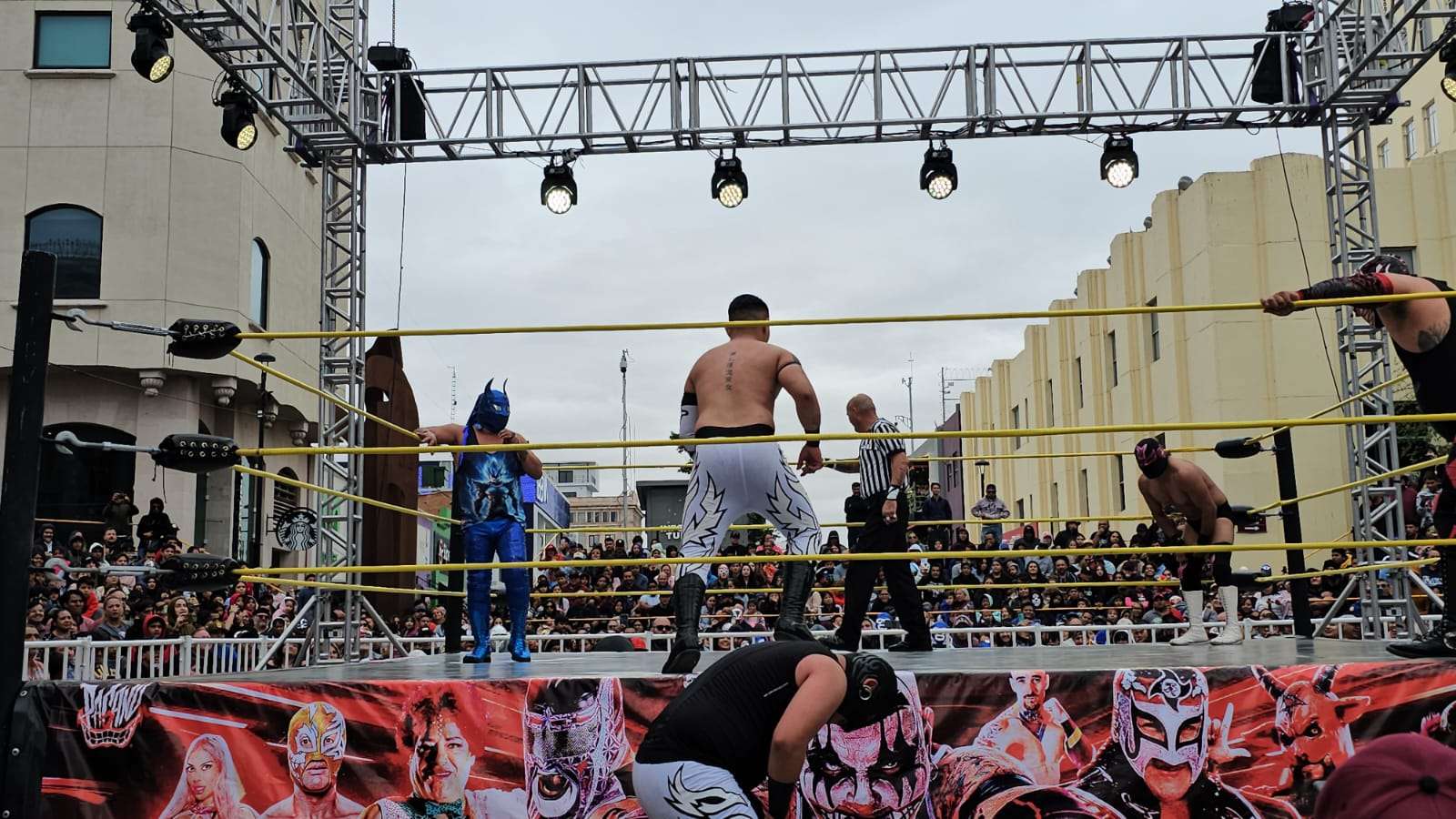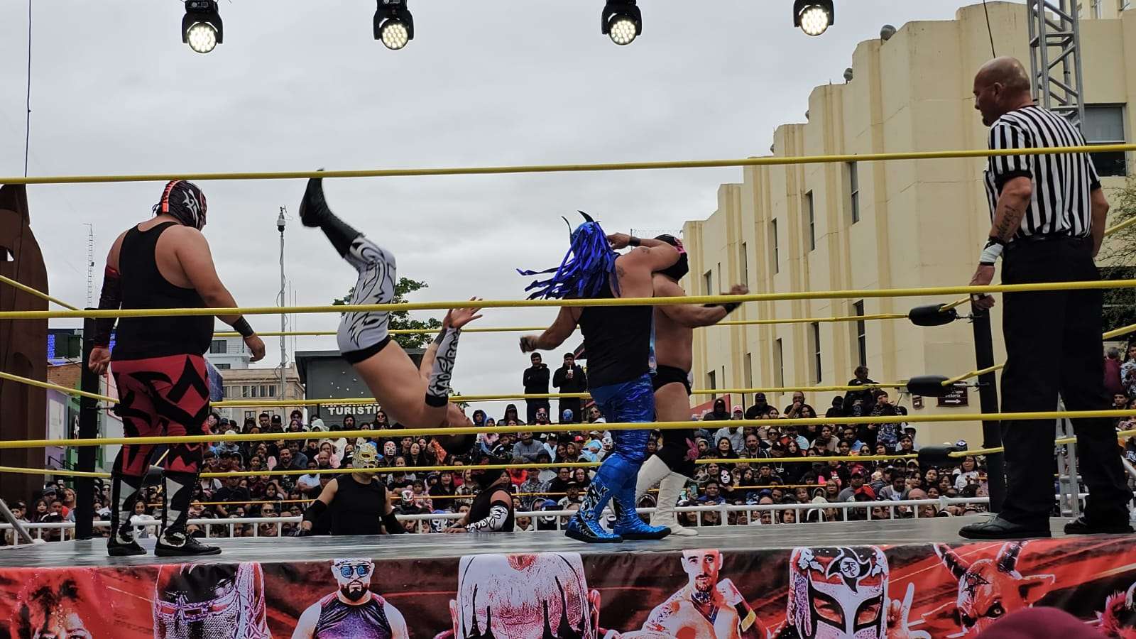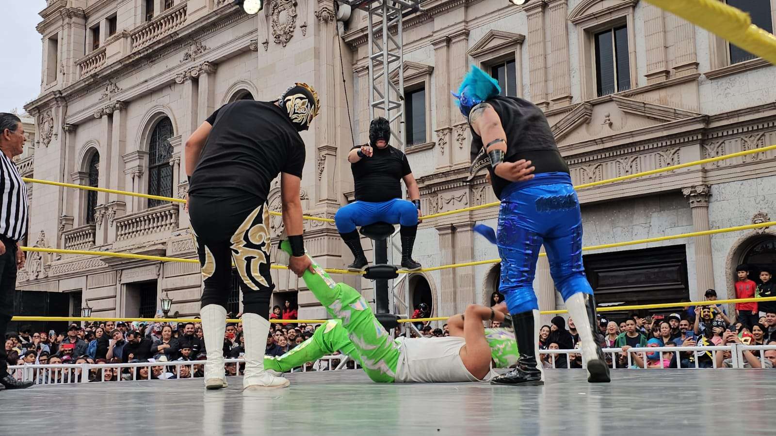 Chihuahua.- La pasión de la lucha libre mexicana se apoderó por completo de la Plaza de Armas este domingo, donde rudos y técnicos contendieron en una caída sin límites de tiempo que mantuvo al filo del asiento a cientos de familias chihuahuenses.