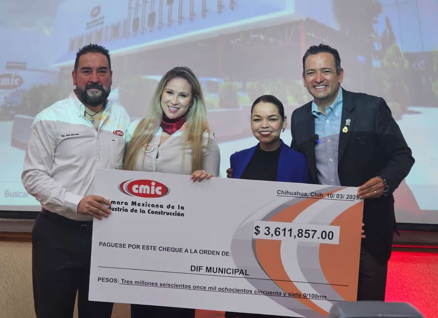 Chihuahua.- El voluntariado de la Cámara Mexicana de la Industria de la Construcción (CMIC) entregó un cheque simbólico por más de tres millones de pesos al Sistema para el Desarrollo Integral de la Familia (DIF) Municipal.