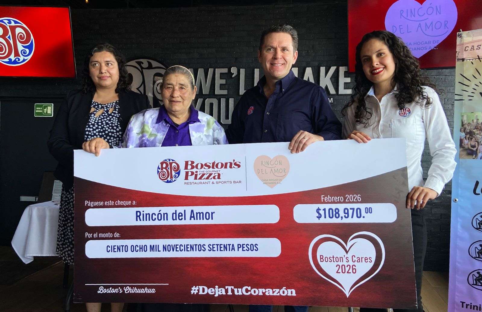 Chihuahua.- Con motivo de la campaña Boston's Cares, se realizó la entrega del cheque simbolico a la casa hogar de ancianos Rincon del Amor A.C., ubicado en la colonia Francisco Villa por la cantidad de 108 mil 970 pesos, como apoyo para los gastos y proyectos de la casa hogar.