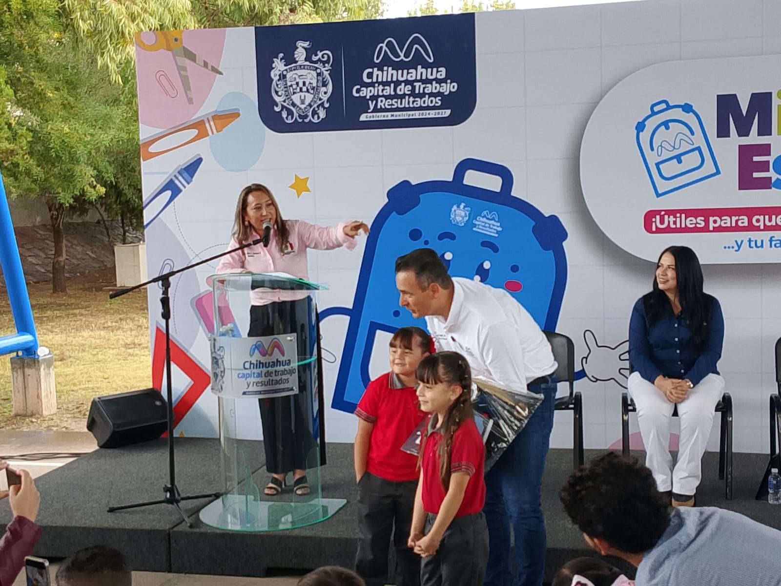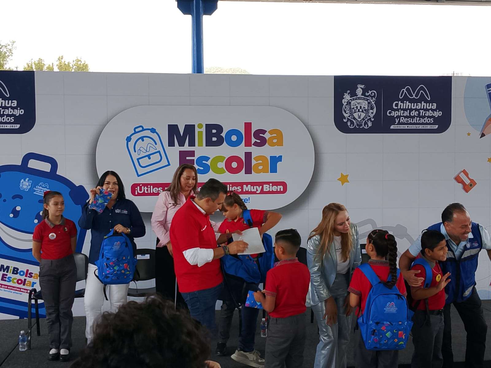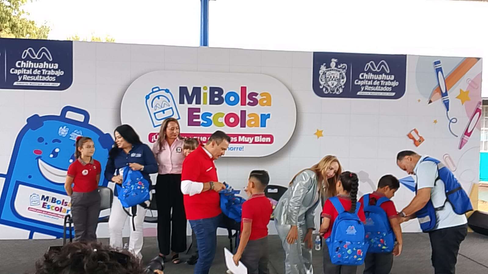 Chihuahua.- El alcalde de Chihuahua, Marco Bonilla, encabezó este lunes el arranque de la entrega de “Mi Bolsa Escolar” en la primaria 24 de Febrero, con lo que dio inicio a la distribución de más de 100 mil paquetes de útiles para estudiantes de nivel básico.