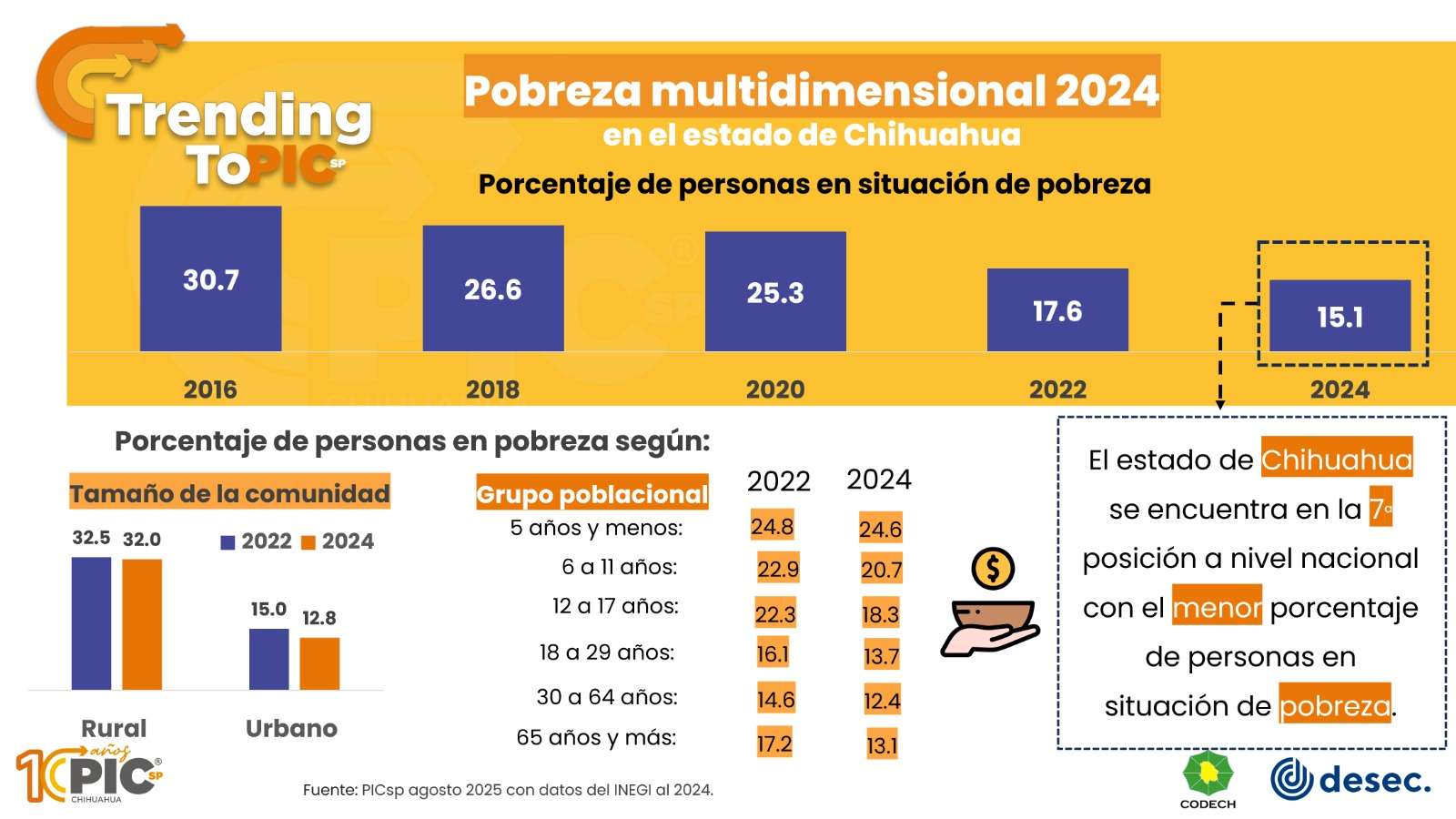 Chihuahua.- De acuerdo a estadísticas del Inegi, reveladas este miércoles 13 de agosto, el estado de Chihuahua se encuentra en la séptima posición a nivel nacional con el menor porcentaje de personas en situación de pobreza.