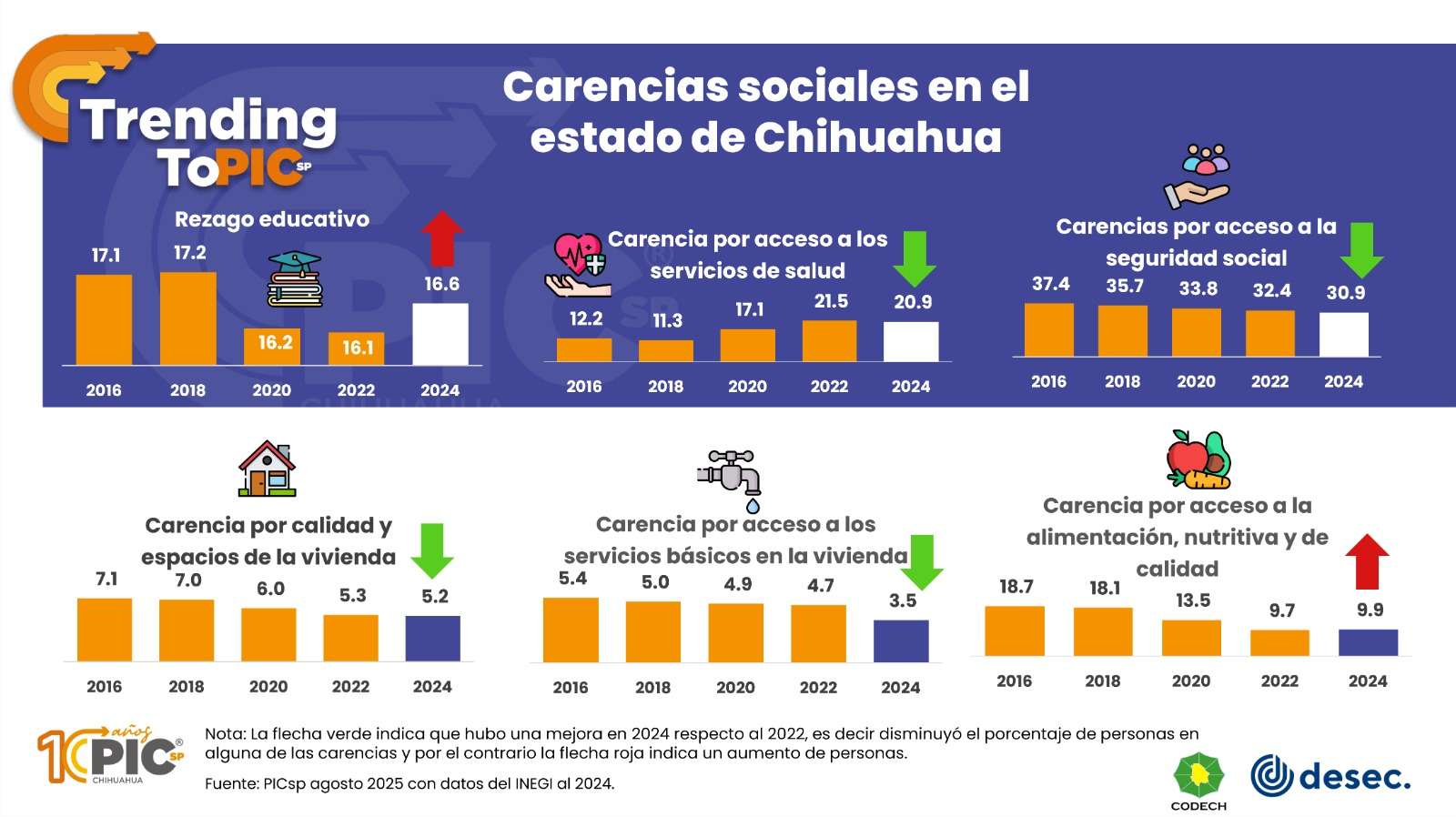 En otro apartado, se muestran seis principales indicadores de carencias sociales en el mismo año.