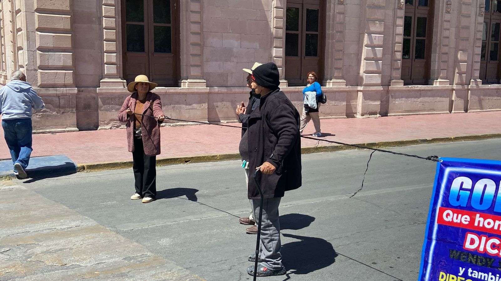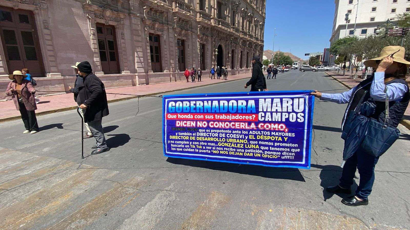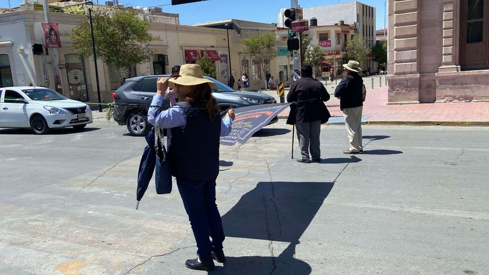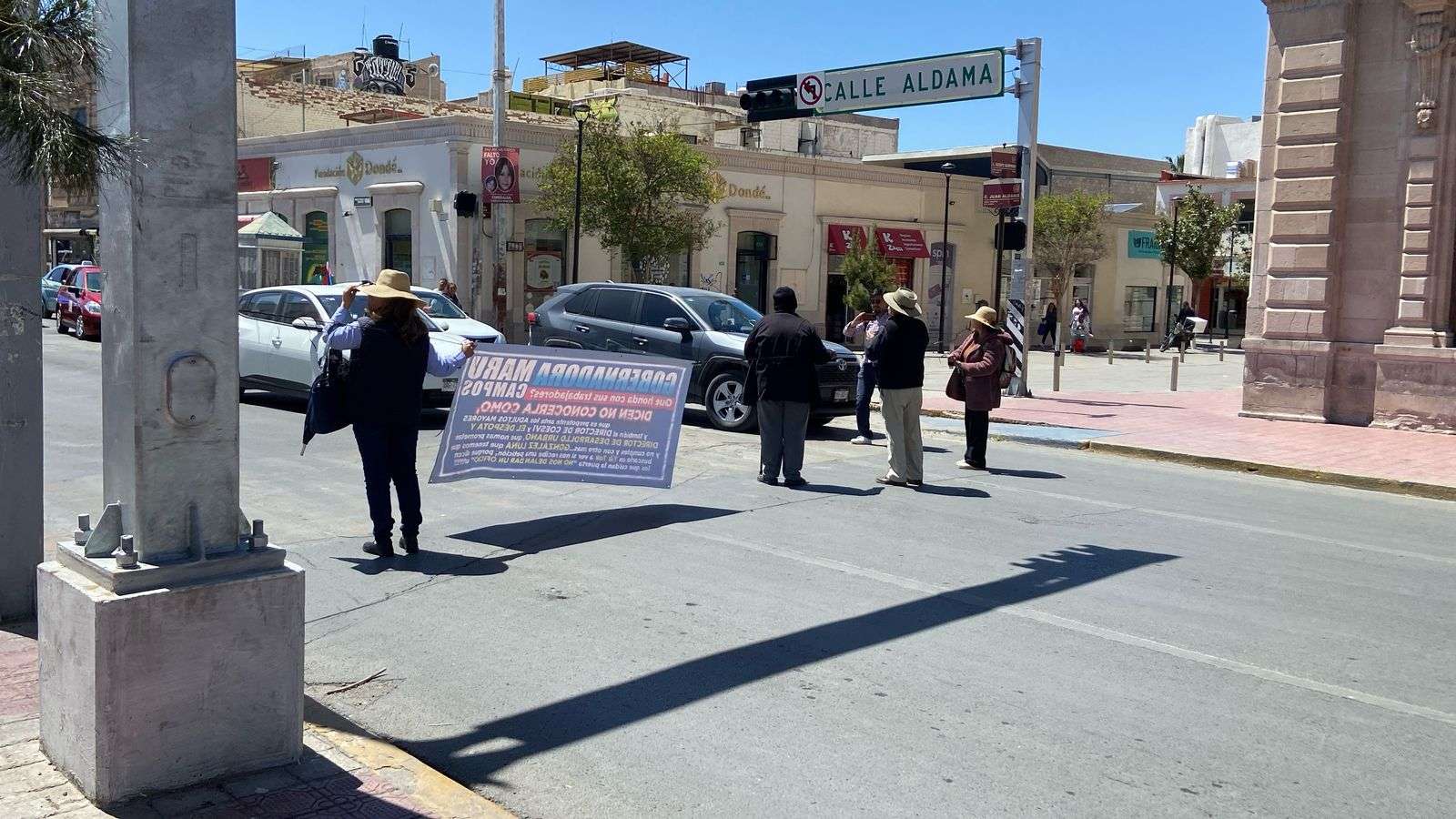 Chihuahua.– Tres mujeres realizaron un plantón en la Cruz de Clavos para exigir ser atendidas por el subsecretario general de Gobierno, Óscar González Luna, ante la falta de respuesta, procedieron a cerrar la circulación de la calle Aldama.