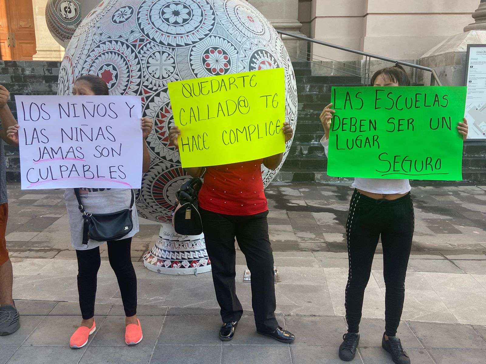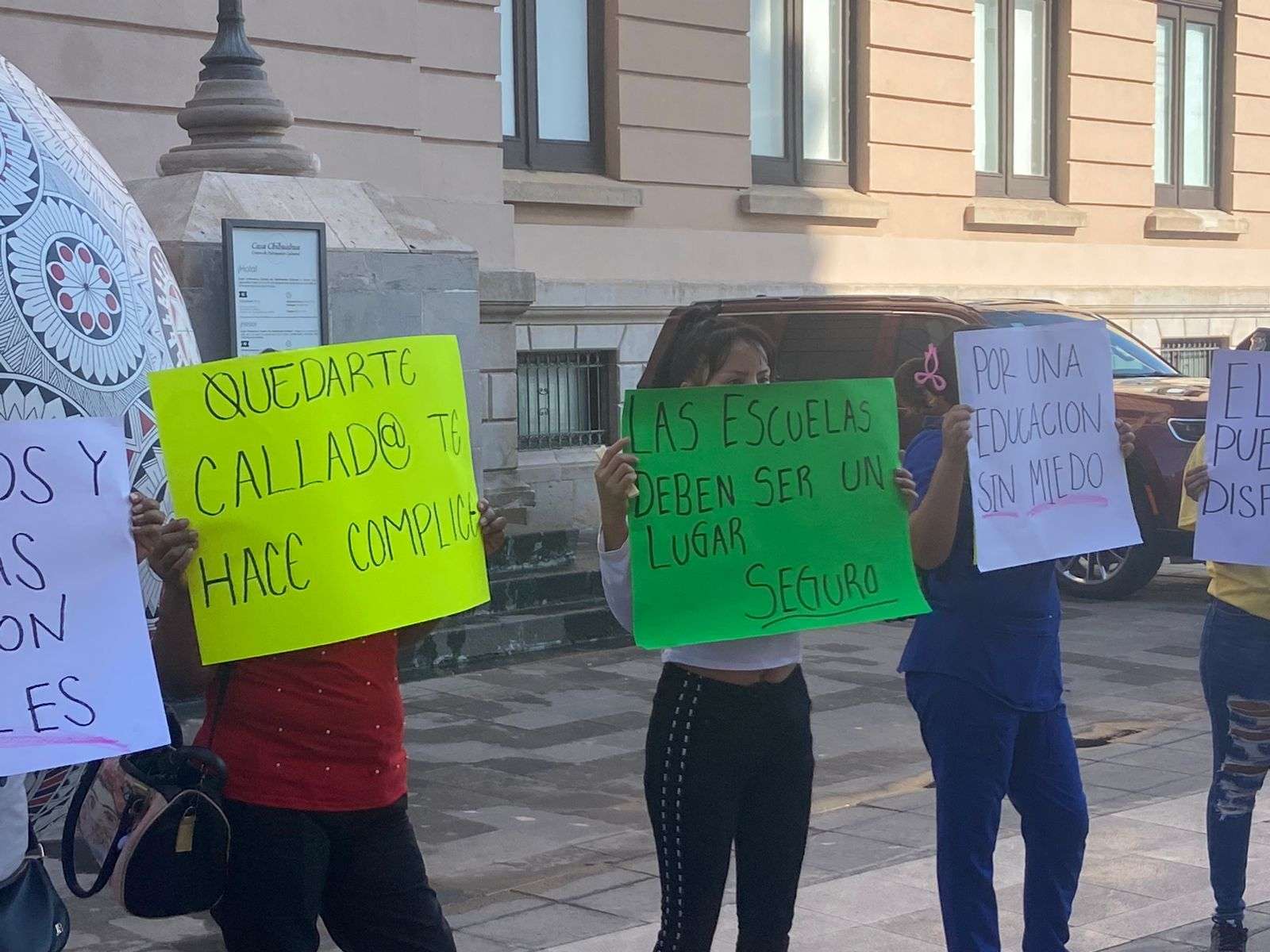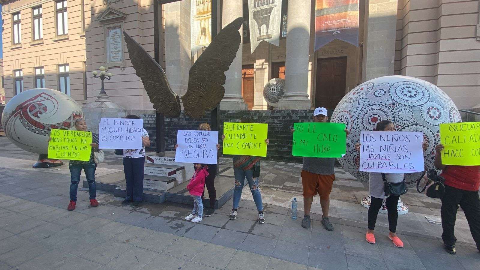 La protesta la realizaron con cartulinas donde señalaban, "Por una educación sin miedo", "Las escuelas deben de ser un lugar seguro", "Quedarte callado te hace cómplice", " El kinder Miguel Hidalgo es cómplice".