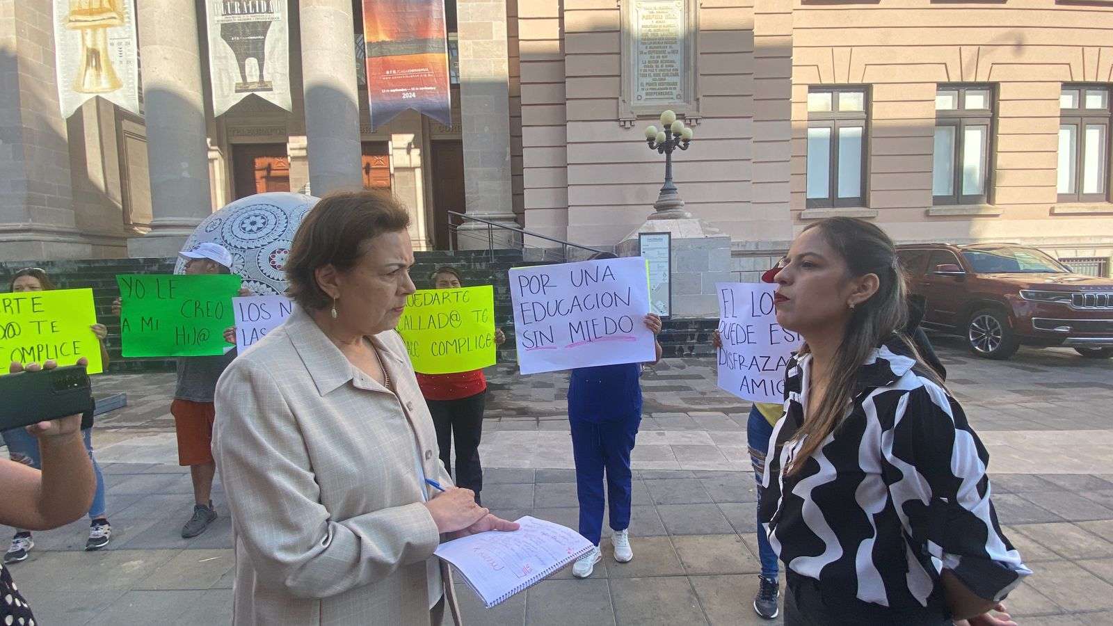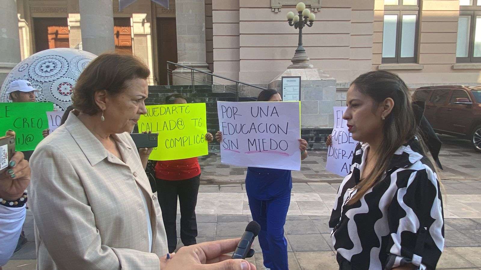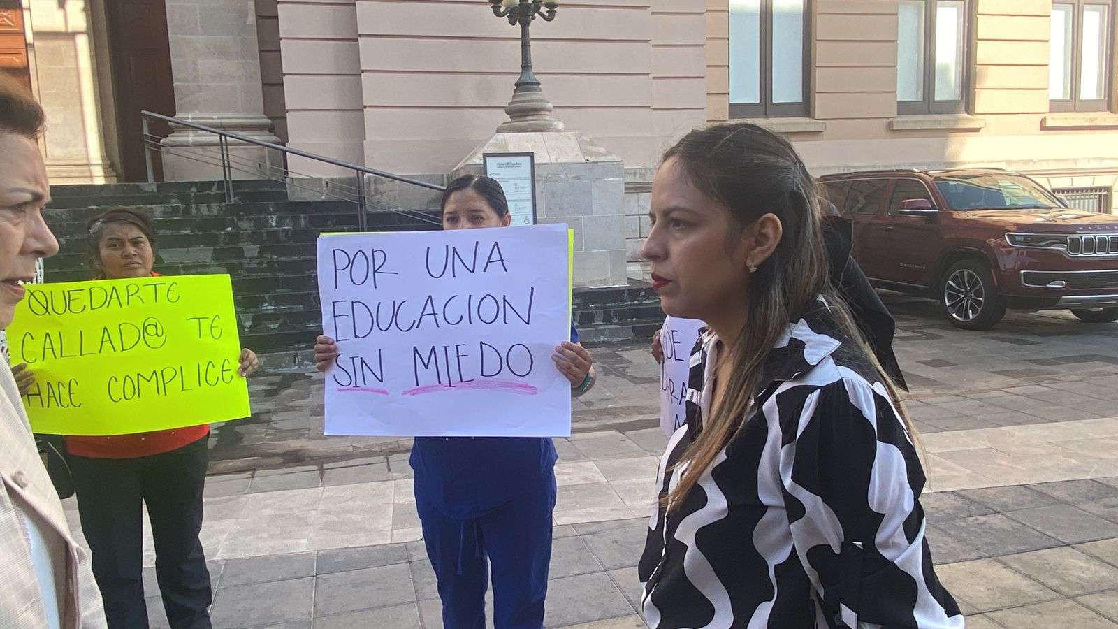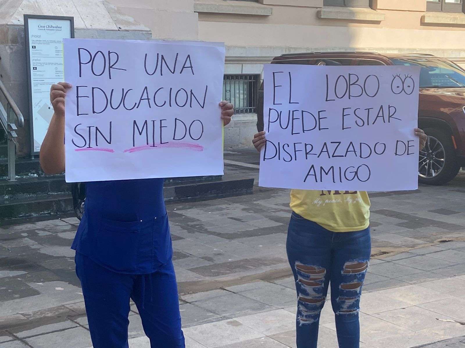 La protesta la realizaron con cartulinas donde señalaban, "Por una educación sin miedo", "Las escuelas deben de ser un lugar seguro", "Quedarte callado te hace cómplice", " El kinder Miguel Hidalgo es cómplice".