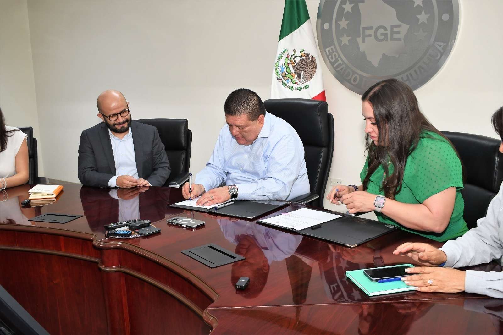 Chihuahua.- El Fiscal General del Estado César Jáuregui Moreno junto con la Fiscal Especializada en Atención a Mujeres Víctimas del Delito por Razones de Género y a la Familia (FEM), Wendy Chávez Villanueva, firmaron un convenio de colaboración con la plataforma digital DiDi, que facilitará el traslado gratuito de mujeres y familias en situación de violencia de género.