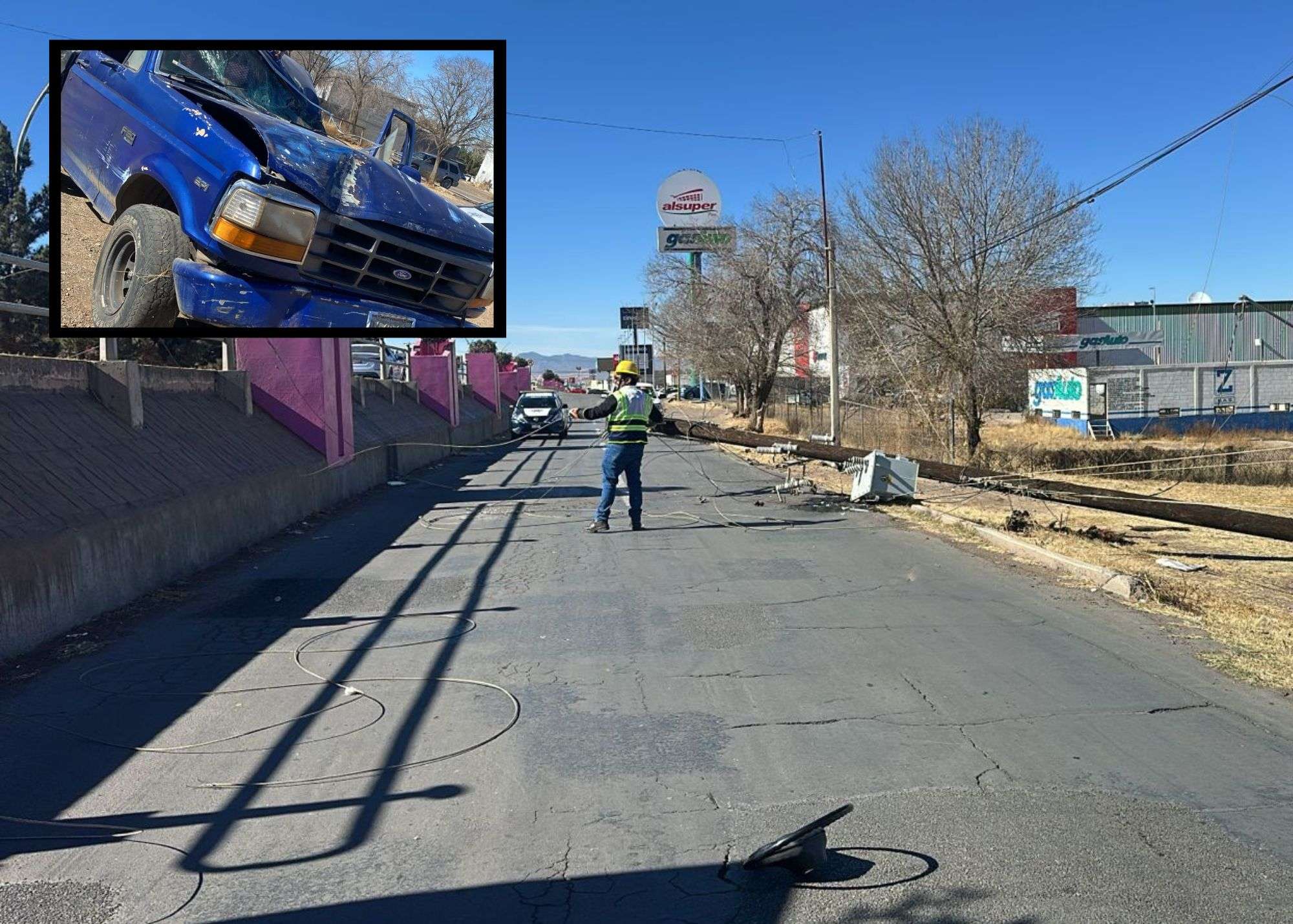 Cuauhtémoc, Chih. – La tarde de este 3 de enero, se registró un hecho vial tipo choque contra objeto fijo sobre la calzada 16 de Septiembre, a la altura de Nicolás Bravo, donde una pickup Ford F-150 color azul impactó un poste de madera con transformador, propiedad de la Comisión Federal de Electricidad (CFE), el hecho fue atendido por la Policía de Vialidad y Tránsito, adscrita al Mando Único.