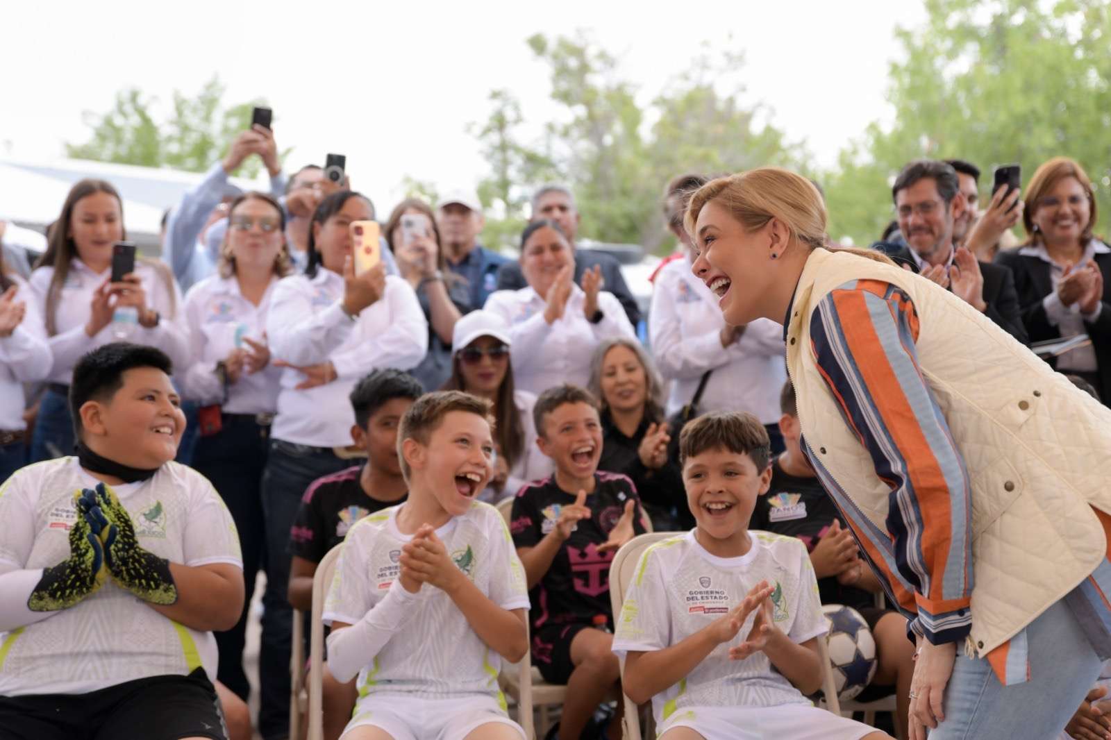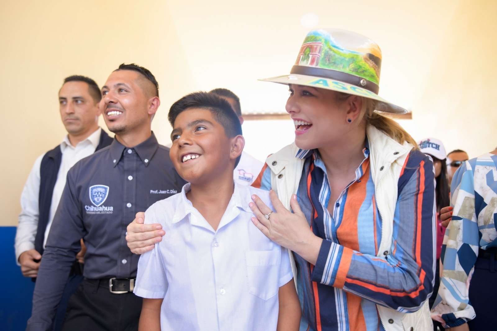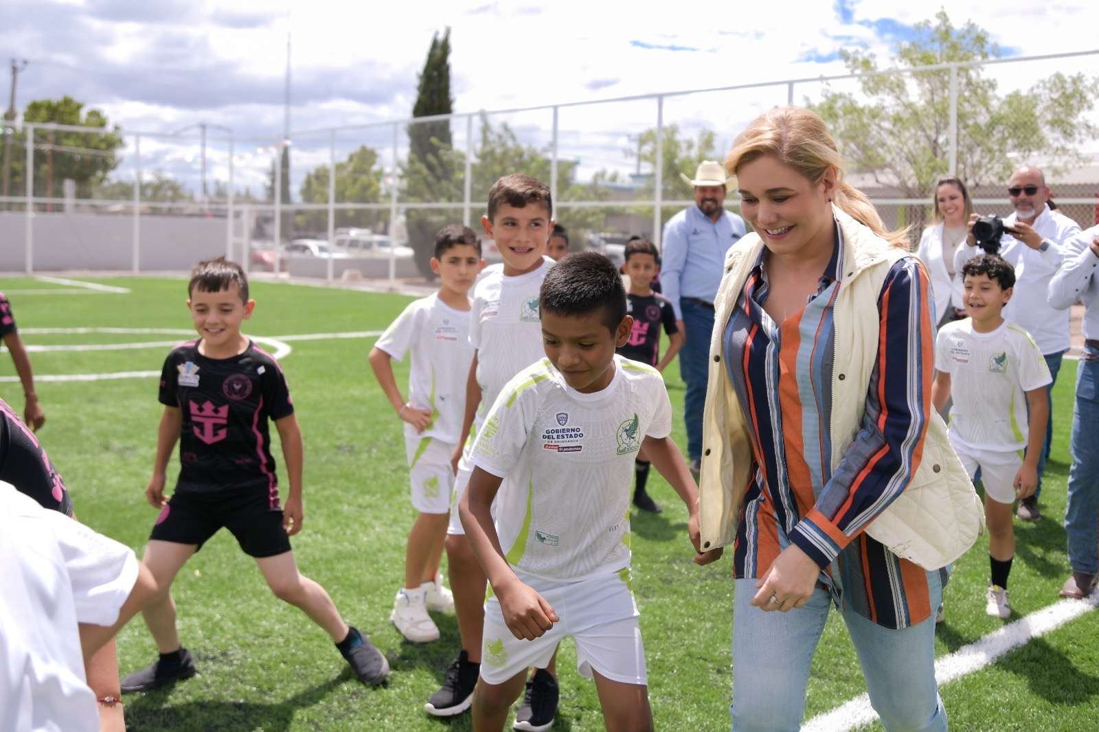 En Janos, con una "cascarita" la mandataria inauguró una cancha de futbol 7x7 con pasto sintético en la escuela Porfirio Talamantes, donde además distribuyó mobiliario educativo para otros 10 planteles, como butacas, pizarrones, aires, tinacos y luminarias.