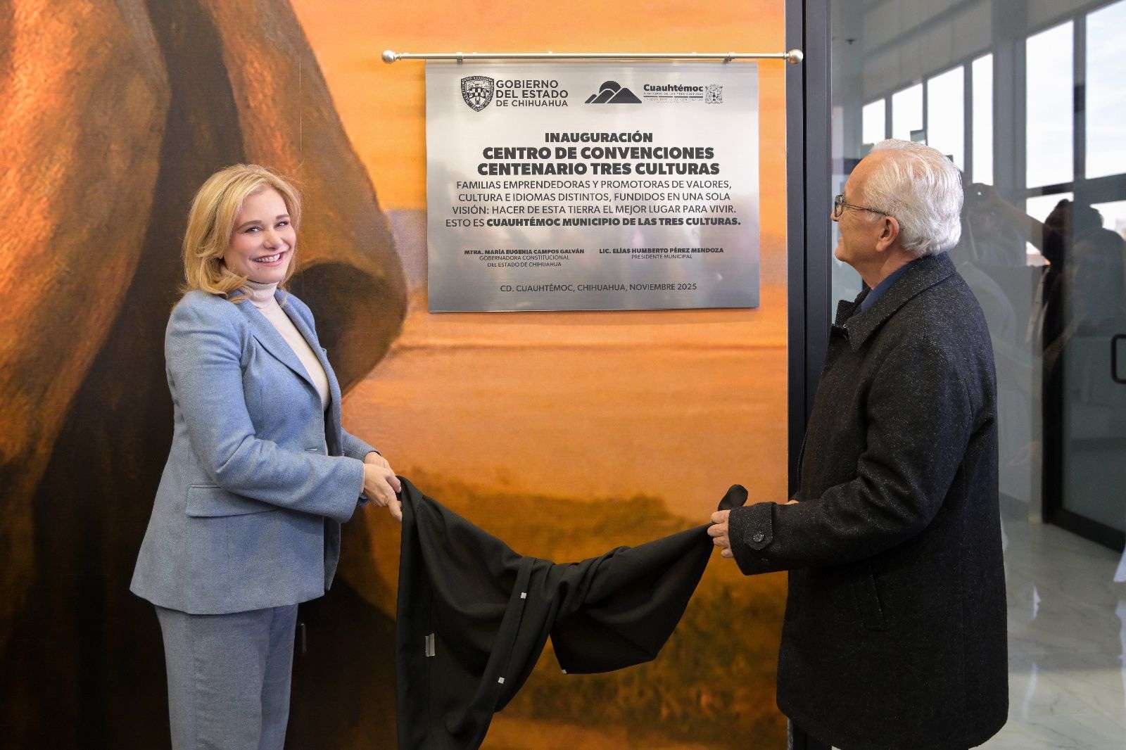 Cuauhtémoc.- La gobernadora Maru Campos encabezó el acto de inauguración del Centro de Convenciones Centenario Tres Culturas de Cuauhtémoc, recinto que impulsará el desarrollo económico y posicionará a la región como referente de conectividad empresarial e industrial.