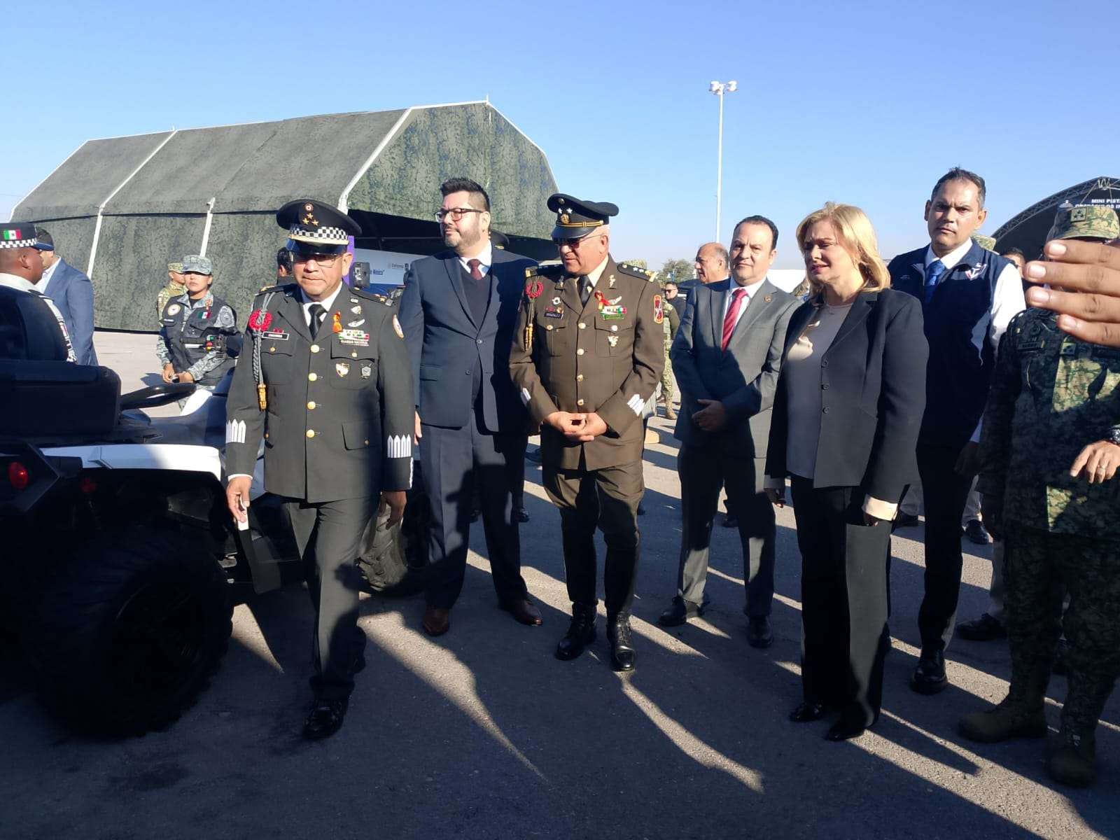 La ceremonia inició con los honores al mando y a la bandera, seguidos del primer pase de aeronaves TS6, que realizaron varias incursiones sobre la zona, sujetas a las condiciones climáticas del día. Tras ello, el comandante de la Quinta Zona Militar dirigió un mensaje oficial en representación del secretario de la Defensa Nacional, Ricardo Treviño Trejo.